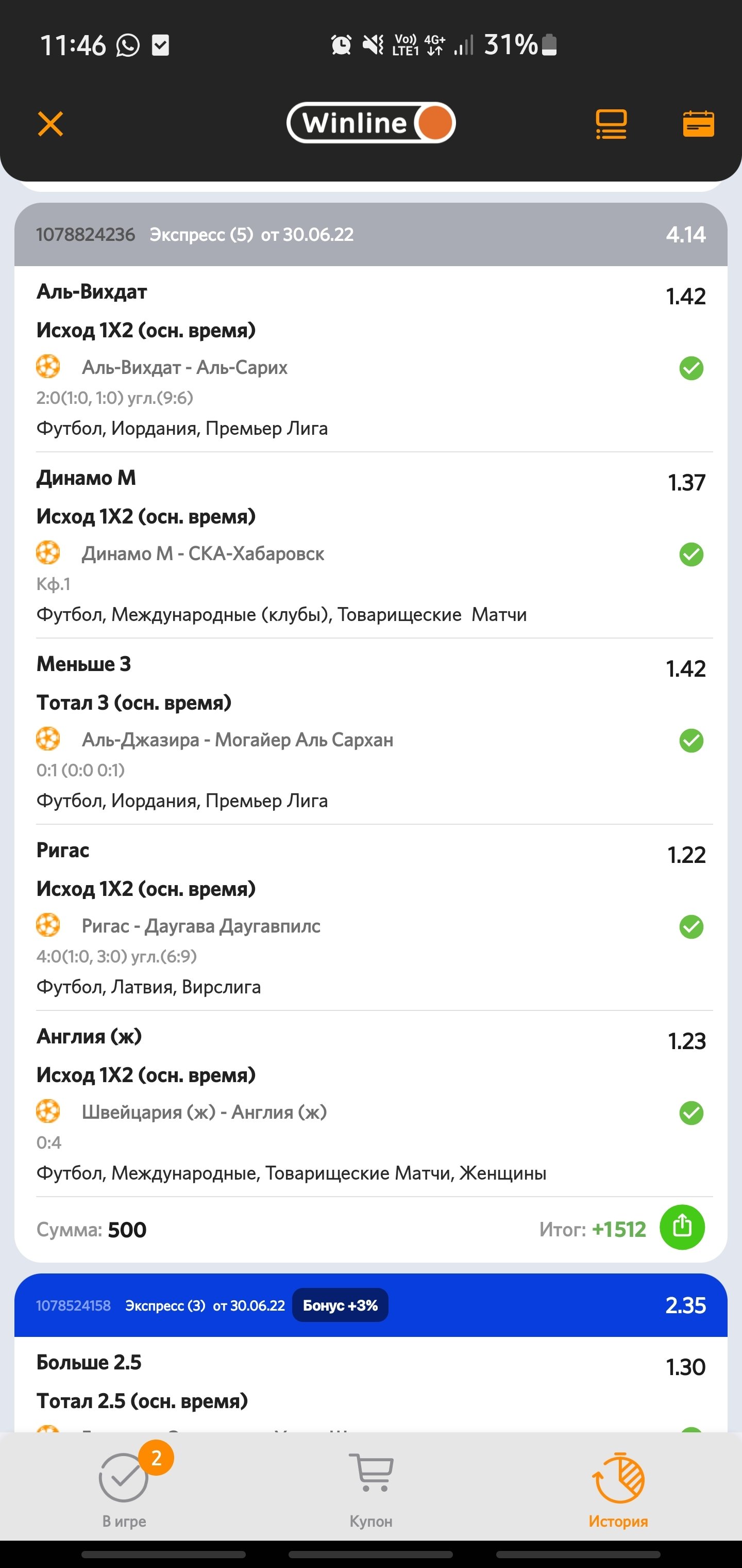 Добрый день. За два дня 4 возврата. Футбол. 1 - в экспрессе сделали возврат ставки Динамо М - Ска Хабаровск. Ставка была на победу Динамо 2. Дали фрибет на 1000р. Матч Хавасса - Адама. Ставка была на победу Адама. Расчёт 0 рублей. Другие два возврата были в одном экспрессе, когда ещё ставка была в лайве. Экспресс не сыграл. Но возврат двух матчей из четырёх был в тот момент когда было не понятно, пройдёт экспресс или нет, все равно не приятно.
