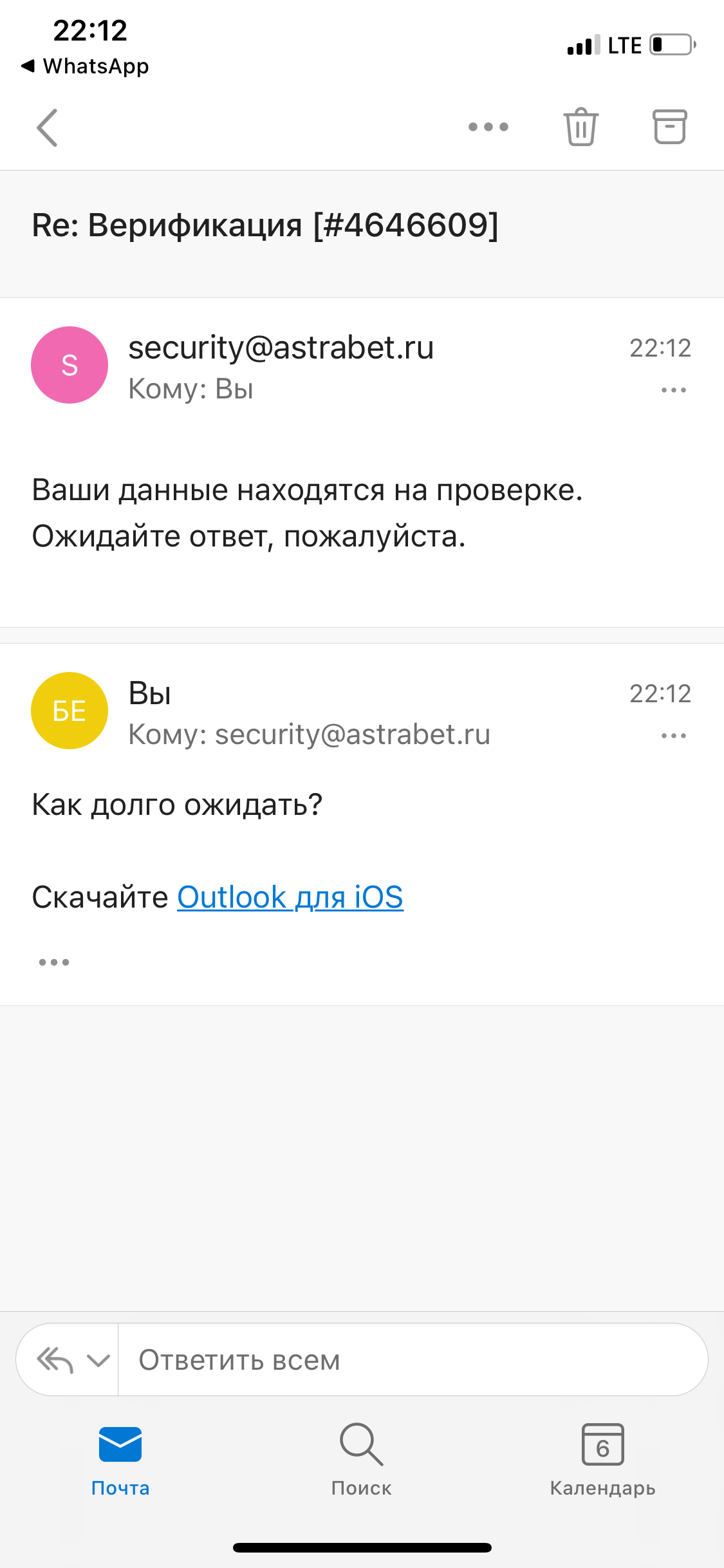 Верификация – это стандартная процедура, проводимая букмекерской конторой. Арбитраж Легалбет не расценивает как основание для жалобы сроки проверки до 10 дней. В случае превышения конторой этих сроков рекомендуем подать новую жалобу.