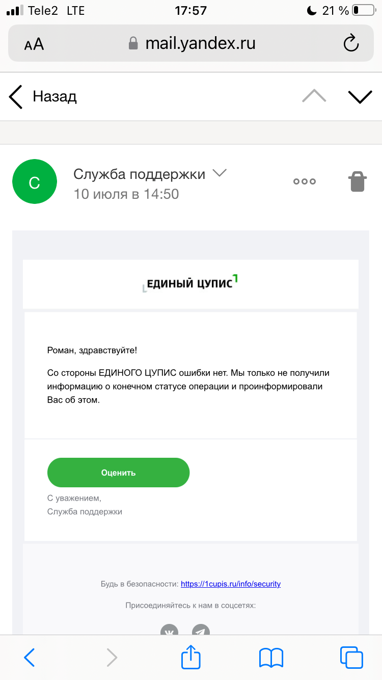 Со стороны Букмекерской Конторы транзакция подтверждена. Сложность возникла на стороне Единого ЦУПИС. Конечный статус транзакция примет в течение 3-х дней. Если у пользователя возникнут дополнительные вопросы, то он может уточнить подробности в Едином ЦУПИС.