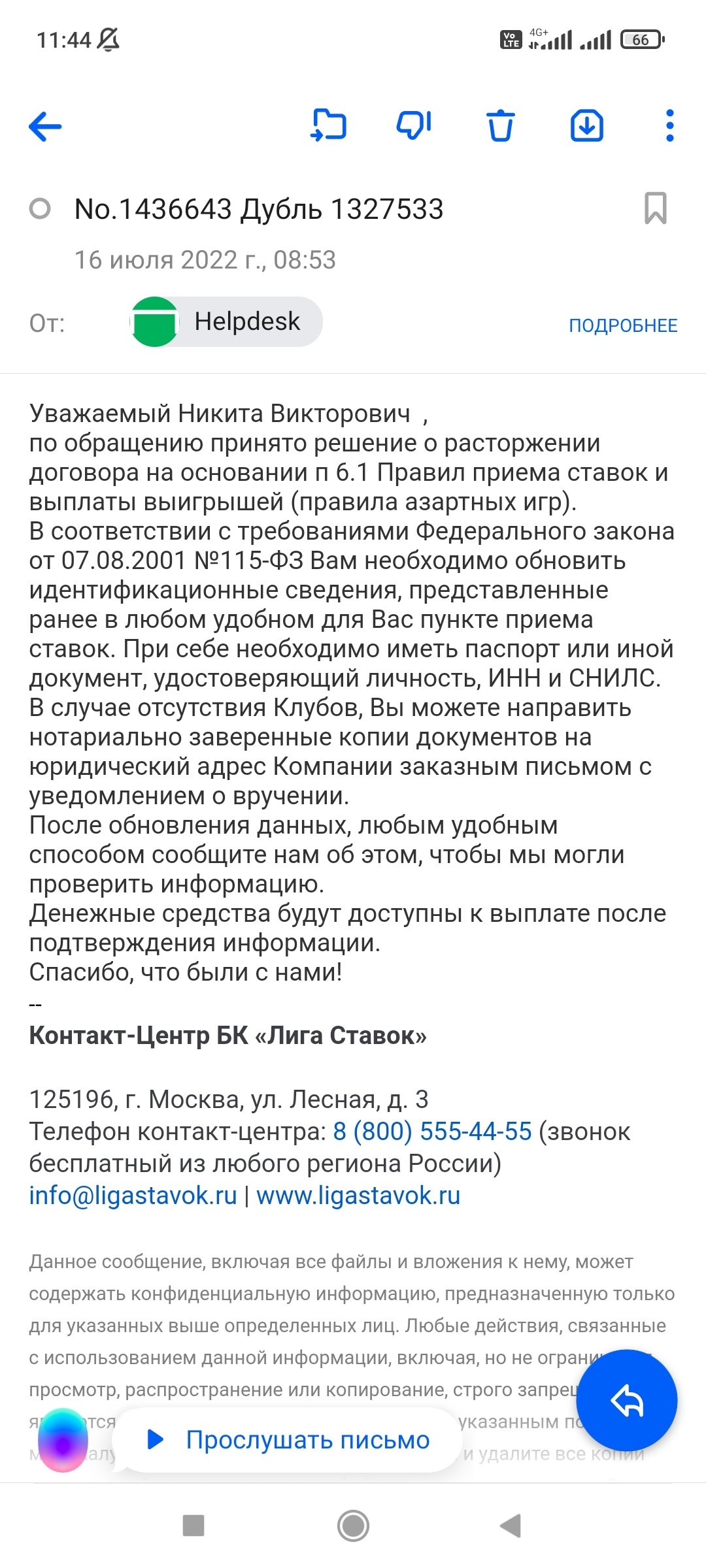 Букмекер отказался возвращать депозит! На все мои требования букмекер отвечает про закон 115! Я проходил идентификацию два раза! Букмекер никакого отношения к закону об отмывании денег не имеет! Максимум кто может требовать от меня обновления данных это цупис! В данной ситуации букмекер занимается самоуправством и насильно удерживает мой депозит!