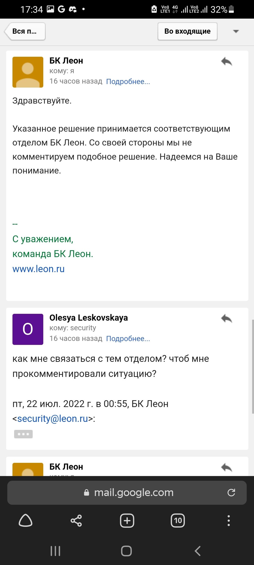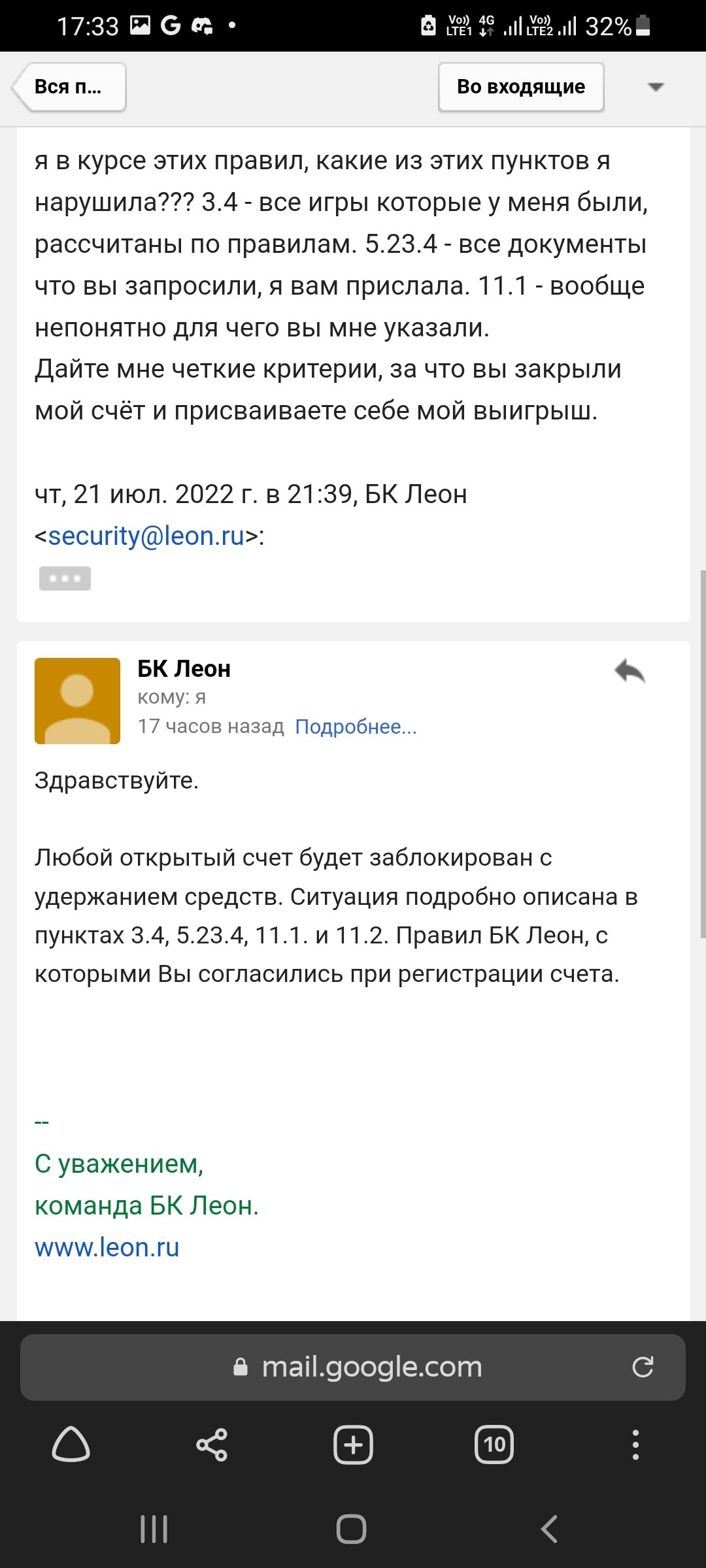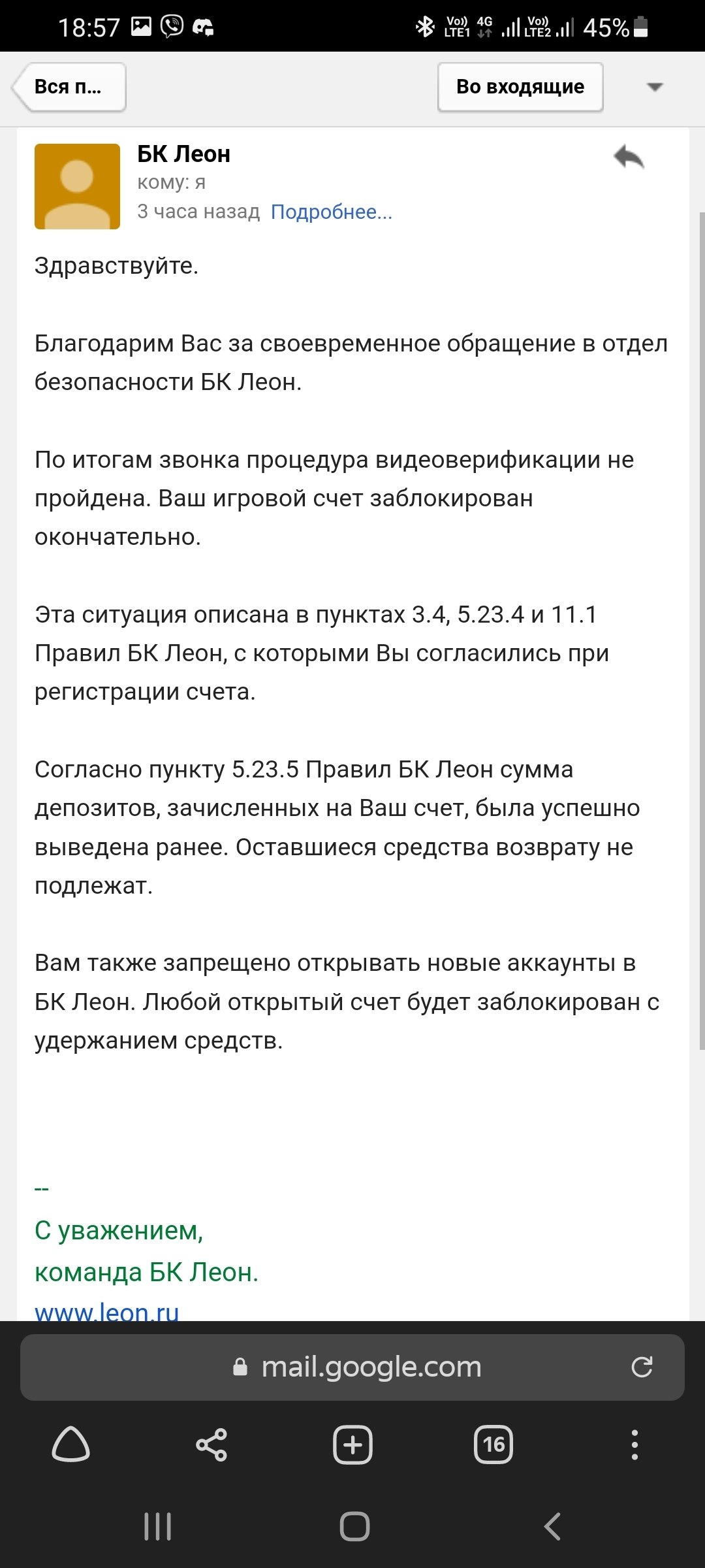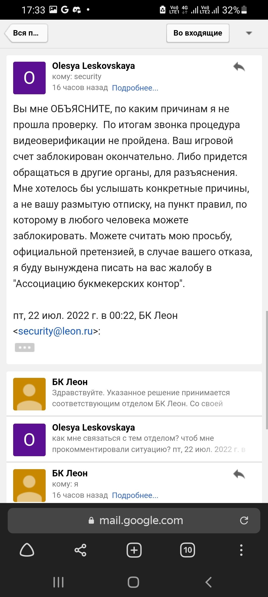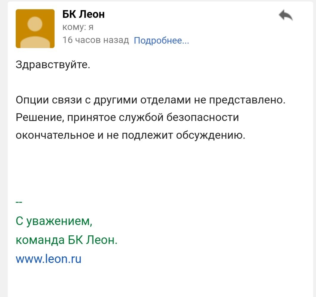Заблокировали счет, после видеоверификации, на мои вопросы "Какая причина" и дать пояснения отказываются, ссылаясь на пункты своих правил, которых я не нарушала. Проблема началась после 2х удачных выводов денег. На третий запрос, сначала просили пройти повторную верификацию, все документы я вовремя предоставила. Счет разблокировали, я снова поставила деньги на вывод, снова повторная верификация, снова все удачно, но деньги так никто и не вывел, а они мне были нужны срочно, я снова их поставила на вывод и мой кабинет заблокировали на проверку на 30 дней. По истечению мне назначили видеоверификацию, на которую мне с графиком работы моей и сотрудников БК не очень удобно было подстроиться, но я ее прошла, на вопросы заданные я ответила. Но БК решила заблокировать мой счет, на мой вопрос о причинах они говорить отказываются. номер игрового счета 65774054