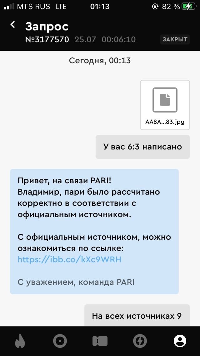 Здравствуйте администрация Легалбет.прошу помочь рассчитать пари правильно ,на официальном сайте РПЛ на который ссылается бк счет ударов в створ 6:3 при обращение в бк мне прислали скрин где указанно что счет 6:4 ,хотя на том же сайте на который они ссылаются счет 6:3 Прикладываю скрин который мне отправила бк ,расчет пари и скрин с того же самого сайта а так же ссылка на сайт РПЛ на который ссылается бк где указанно счет ударов в створ 6:3! официальном : прошу обратить внимание на последовательность предоставленный скринов: 1)расчет пари 2)СКРИН ОТ БК С ЛИПОВЫМ СЧЕТОМ УДАРОВ В СТВОР А ИМЕННО 6:4 3)Скрин с того же самого сайта на который ссылается бк где счет ударов в створ 6:3 Прошу Легалбет помочь разобраться с данной проблемой и восстановить справедливость!