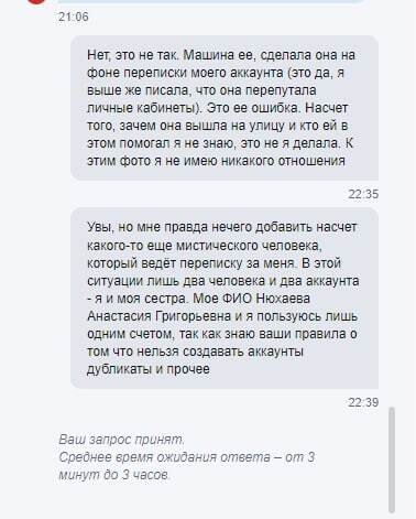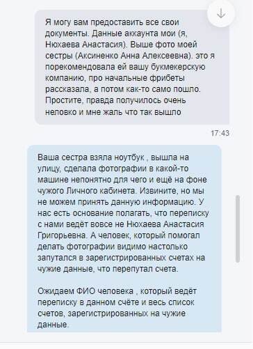 запросили верификацию. Не знаю почему, может потому-что мы с сестрой играли с одного ноутбука, но при этом аккаунт сестры не был в блокировке до сегодняшнего дня. Моя сестра перепутала аккаунты, зашла и отправила верификацию своих фото в техническую поддержку фонбет. Я рассказала им правду, как есть. Теперь они говорят что моя история неубедительна и просят ФИО еще какого-то человека «который ведет переписку в данном счете и весь список счетов, зарегистрированных на чужие данные. Иного решения не будет.». Скриншоты переписки с тех поддержкой прикрепляю. И что вот мне делать если так и есть? Я заложник данной ситуации, во всем виновата моя сестра, из-за этого администрация фонбет мне не верит. У вас максимум можно 3 файла прикрепить