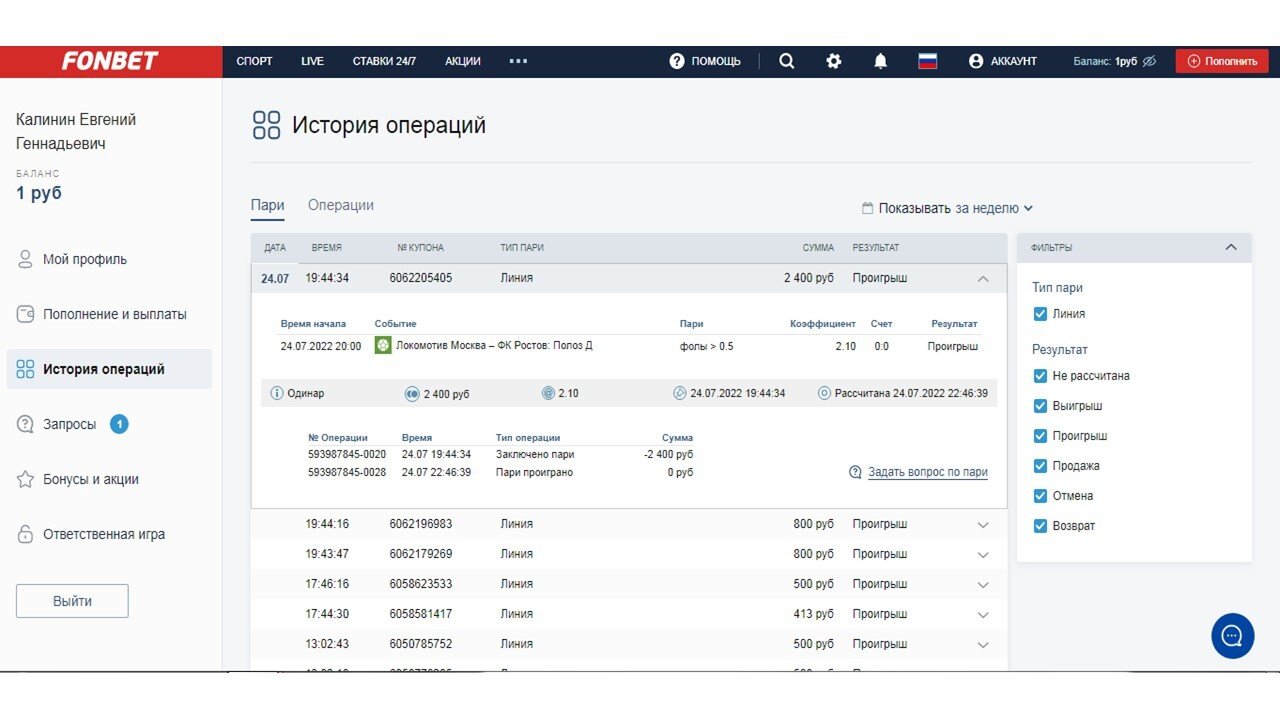 № моего счета в Фонбэт 7358127. сделал ставку (№ купона 6062205405 ) Локомотив Москва – ФК Ростов: Полоз Д фолы больше 0,5 кэф. 2.1фолы > На 30 минуте матча Полоз сносит игрока соперника и ДАЖЕ ПОЛУЧАЕТ ЖЕЛТУЮ КАРТОЧКУ за это. Букмекр рассчитывает ставку как проигрышную. Переписка ничего, кроме нервотрепки, не даёт.