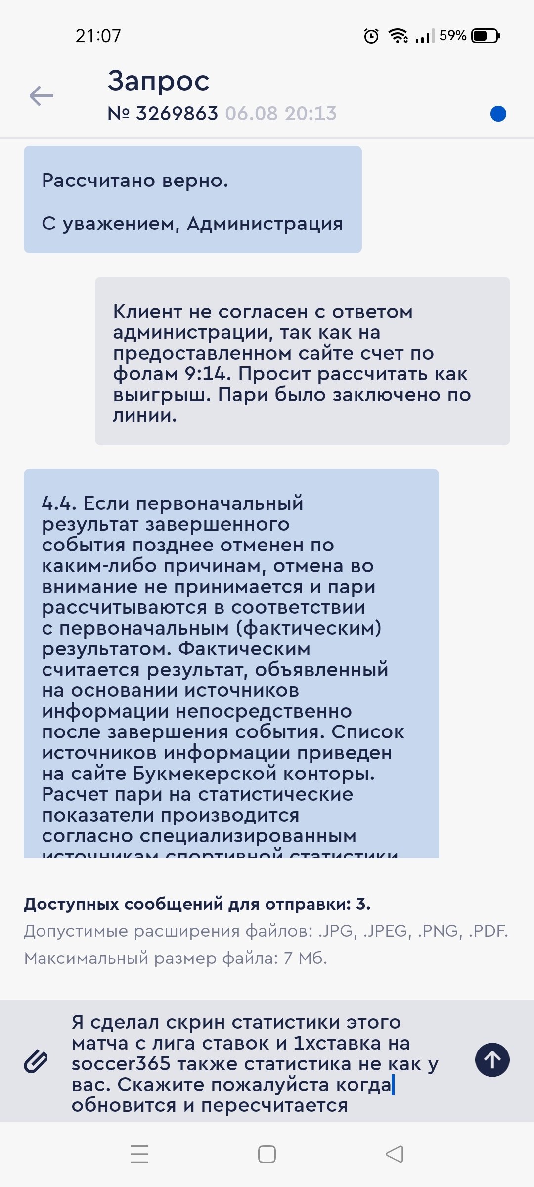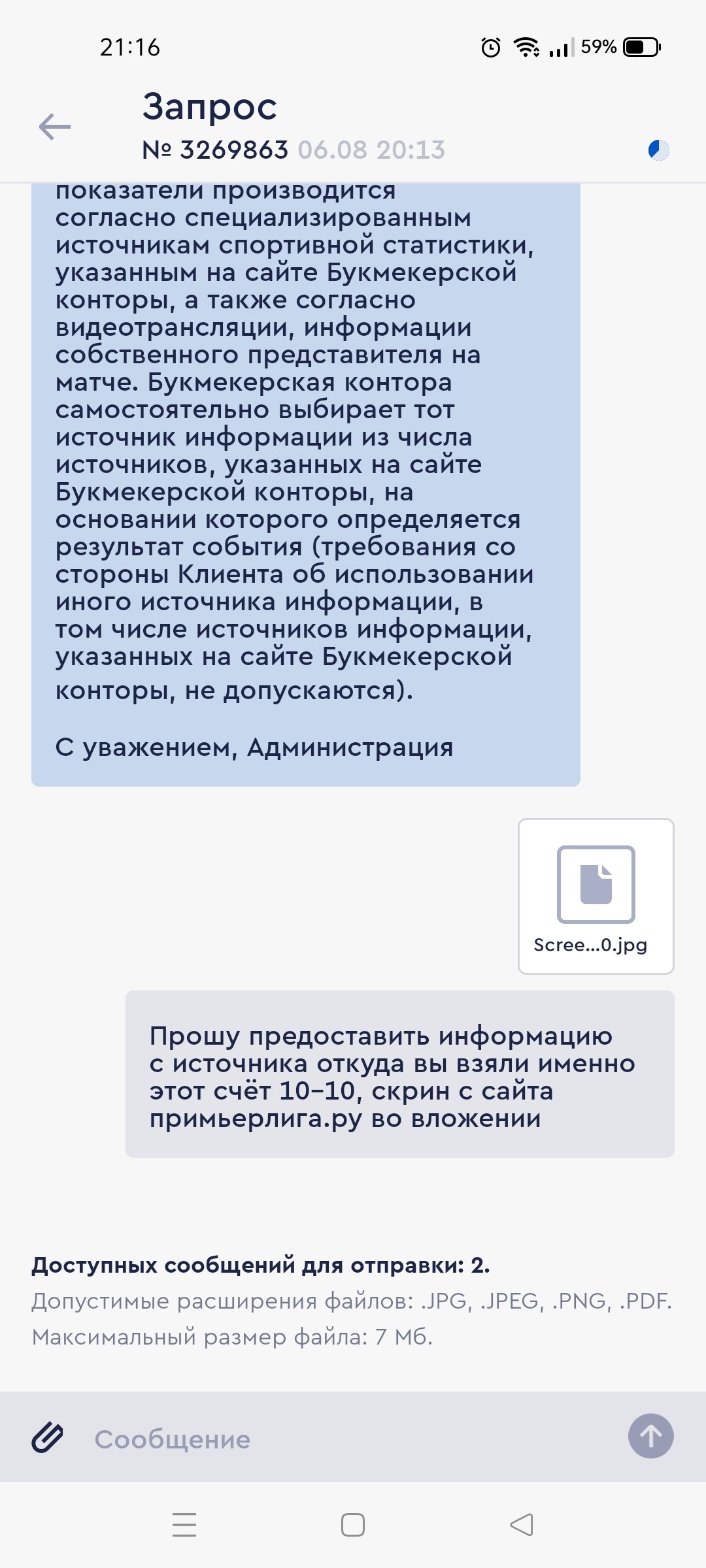 Здравствуйте был составлен экспресс по линии на 4 события, 3 из них выиграли а последнее событие в частности матч между Уралом и Спартаком признали проигранным. Моя ставка в экспрессе была на том что в матче будет больше 21.5 фолов.По факту с официальных ресурсов такие как Премьер-Лига.ру в протоколе этого матча по статистике 23 фола счёт 9-14, но Фонбет это объясняет что первый протокол на ресурсе Премьер-Лига.ру пришло со значение 20 фолов (10-10) и отказывается рассчитать как выигрыш. Также добавляю скриншоты ставки, переписки с тех.поддержкой БК Фонбет и протокол матча с официального рессурса Премьер-Лига.ру