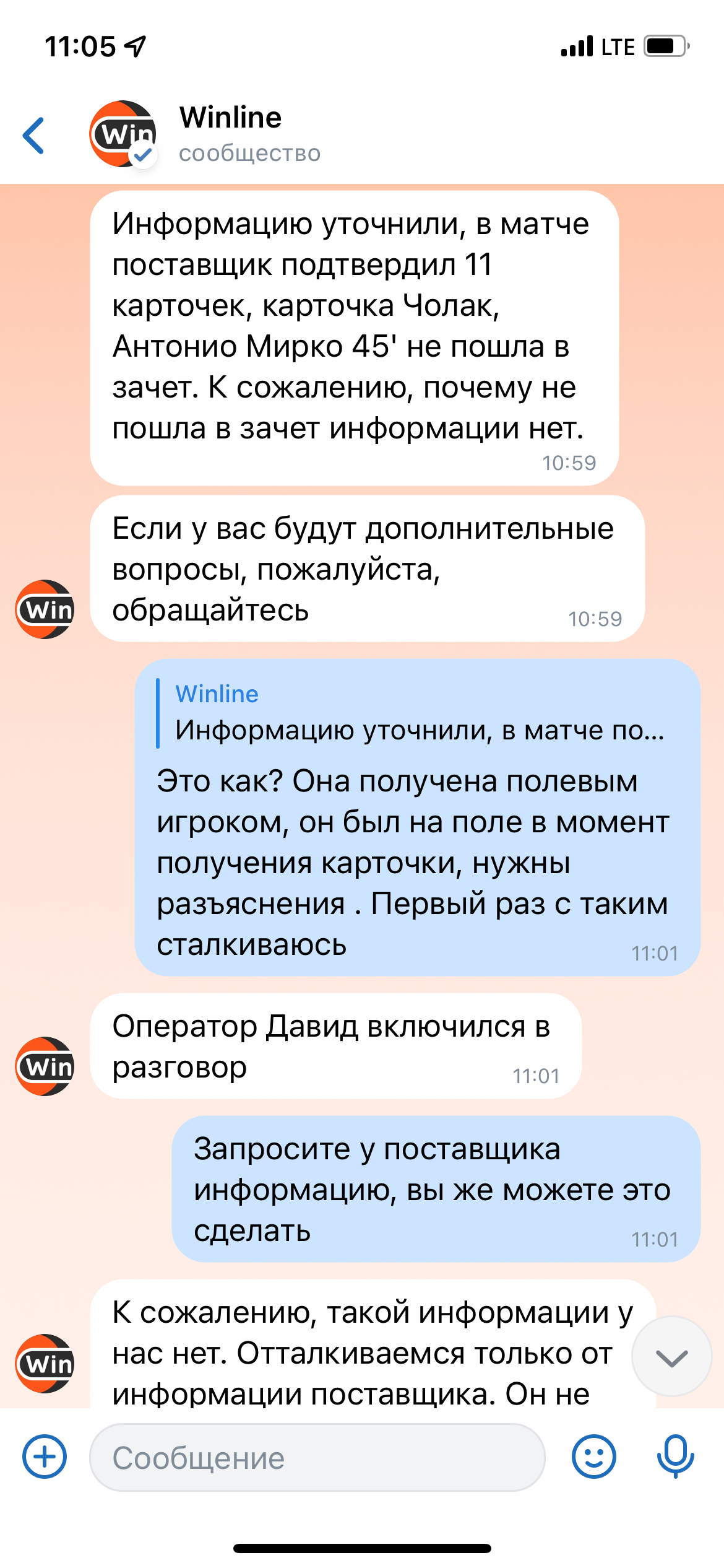 Второй день эпопеи. Опять скидываю результат со sportradar, мне отвечают, что карточек 11. Но у винлайна (который заплатит без вариантов, ага) есть такое правило, что вторая желтая карточка и последовавшая за ней красная равна двум картам и, с учётом ещё 10 желтых, их ровно 12. В итоге они в очередной раз затевают проверку и снова мимо, их поставщик предоставил им протокол, карт 11, карточка Чолака на 45 минуте не вошла в протокол… ЧЕГО??? Он полевой игрок, был на поле в момент получения карточки, получил ее, в протоколе УЕФА она есть, дайте хоть какие-то разъяснения. Нет, разъяснений нет, ниче не знаем, мы слепые, ниче не понимаем, поставщик сказал 11 карт, ниче не можем сделать. Так закончился второй день, винлайн кинул без вариантов.