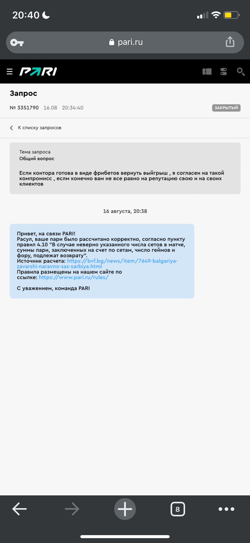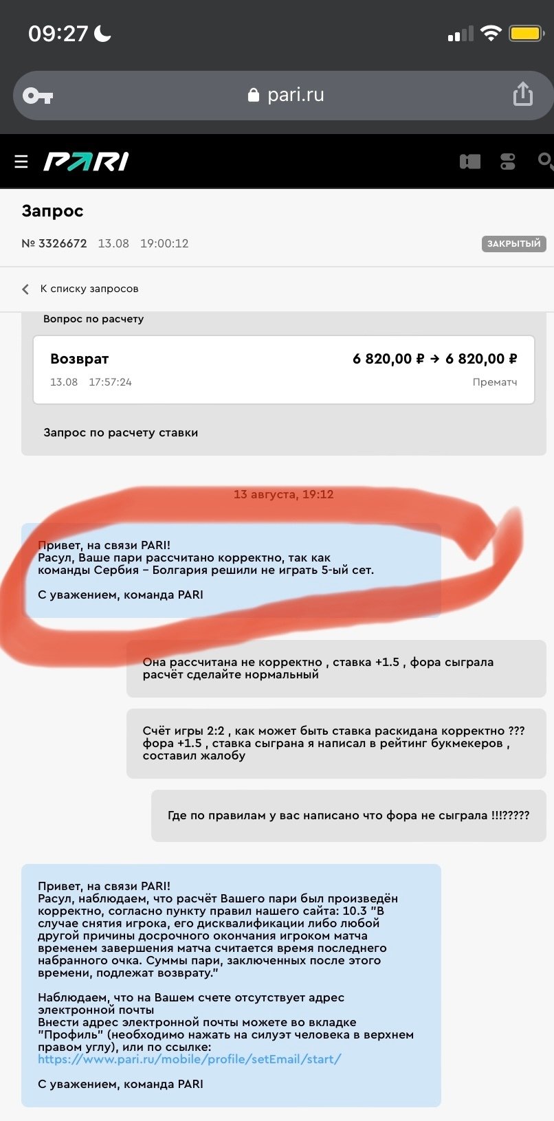 Поставил на волейбол Сербия Болгария , фора Болгарии по сетам +1.5 , ставил при счёте 2:0 в пользу Сербии , счёт ставь 2:2 по сетам , команды решили не играть 5 сет , ставка сделали возврат ссылаясь на пункт правил 10.4 (В случае не верно указных количестве сетов в матче …. ) так количество сетов было указано правильно , команды решили не доигрывать 5 сет , по правилам этой же конторы пункт правил 10.3 ( в случае снятия игрока , его дисквалификации либо другой любой причины досрочного окончания игроком матча , временем завершения матча считается время последнего набранного очка ) то есть фактически счёт 2:2 моя ставка сыграла , то что они после 4 сета решили не играть 5 сет это как раз пункт правил 10.3 а не 10.4 как хочет это сделать букмекер , прошу помочь разрешить этот произвол со стороны букмекера