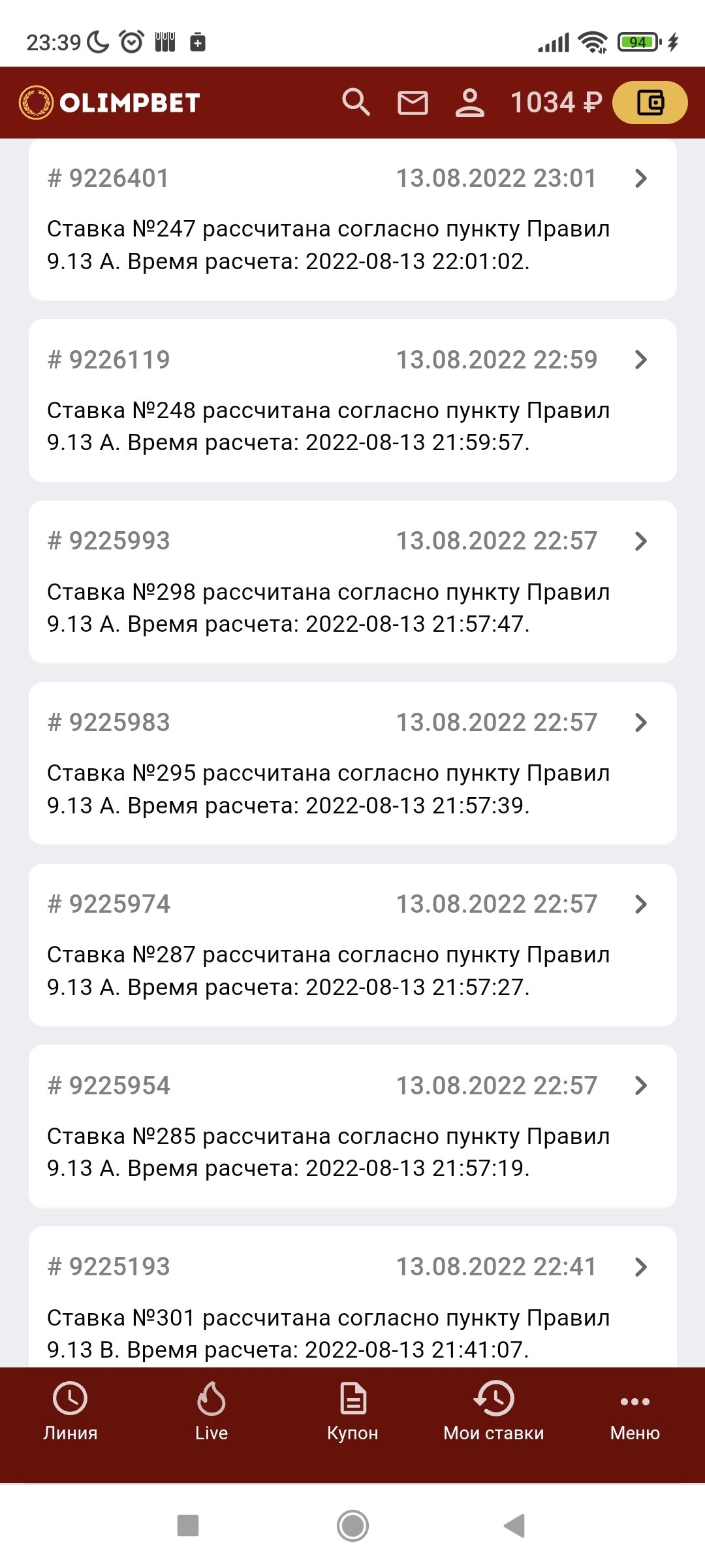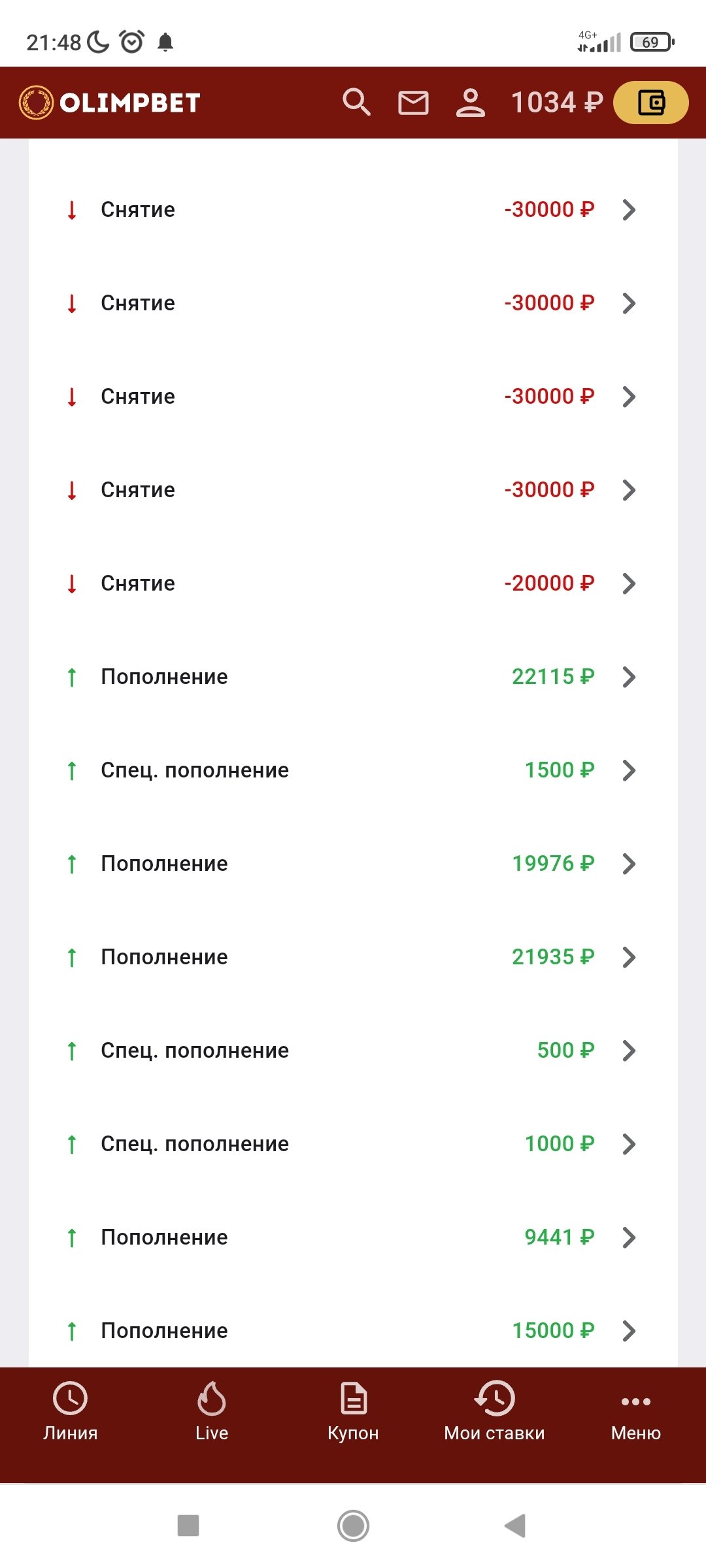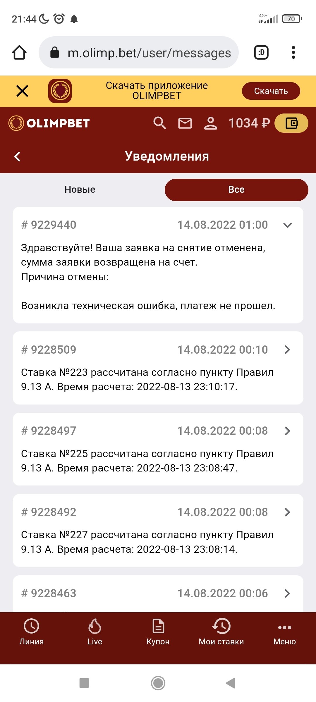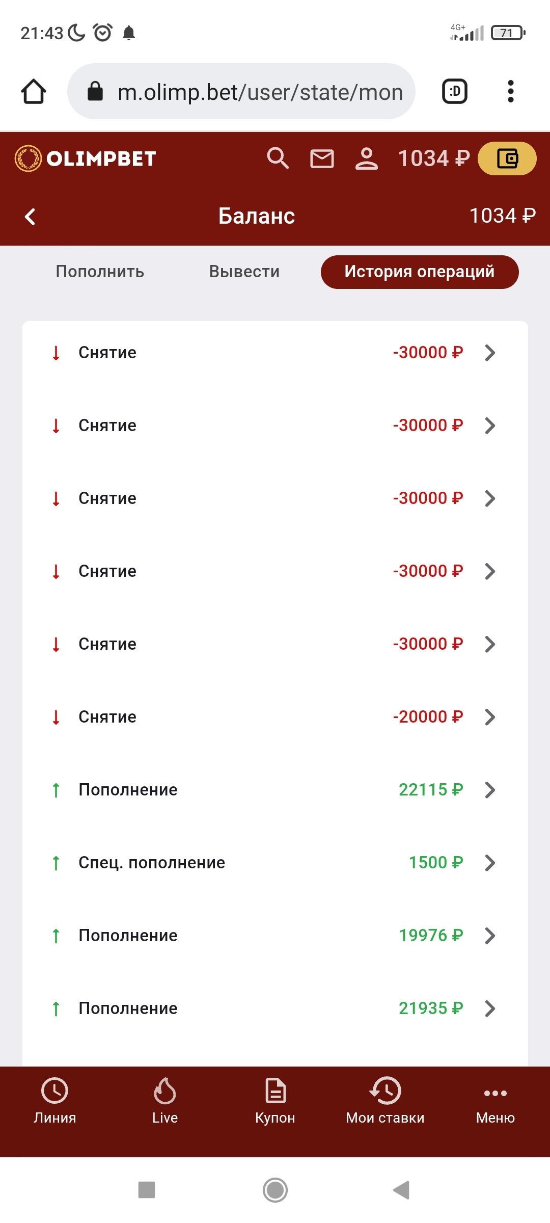 Здравствуйте, . 2022 спокойным образом делал ставки😌, в числе которых ставки под номерами 299, 300, 301 и 302, выделяю их отдельно, поскольку все началось с них. Данные ставки делал по система флэт, на каждых исход была сделана ставка в 20 тысяч рублей. Все они оказались выигрышными, хотя одна чуть не проиграла, в остальных уверенные выигрыши, по итогу их рассчитали, на моем балансе было 123 тысячи рублей+🎊🍾 (не успел запомнить до рубля, далее поймете по чему). Далее начинается веселье. Одну из ставок пересчитывают с коэффициентом 1 — возврат…😒 Обидно ? — обидно, но я играю на Олимпе не первый день и пару раз уже были таки инциденты, но не на такие суммы, да и я только что выиграл за вычетом перерасчета порядка 40 тысяч рублей, знаете, чувство радости было сильнее 🤑🤑🤑..., но не буду отвлекаться, продолжу рассказ. Пишу в СП: Служба поддержки ссылается на пункт правил " А", " В" и " Д" (о " А" и " Д" позже) был ли он там ? — НЕТ❗️, не врите ни мне, ни себе, матчи были в live, за одним вообще следил все сеты, коэффициенты прыгали вверх вниз, пока не поставил "принять при повышении", ставки не принимались, ставки выиграли, исходы я выбирал не какие-нибудь нетипичные, вроде: "В какой руке игрок №1 будет крутить ракетку", где возможен «глюк», ошибка или что-то им подобное, а победы в матчах и сетах🤬🤬🤬. Имейте уважение к игроку, я молчал когда вы просто произвольно по своему усмотрению коэффициенты меняли, но когда так в наглую и в ряд терпения уже никакого нет! К тому же это именно предвзятое отношение, поскольку изначально все началось с возвратов, а не перерасчетов! Читайте дальше! Далее ставлю на вывод 70 тысяч рублей, на балансе остается чуть больше 40 тысяч рублей и убираю телефон и компьютер в сторонку отправляясь заниматься делами по дому, для моего аккаунта в этом нет никаких сверх сумм🤷♂️, поскольку пополнял зачастую на большие суммы, были не единожды пополнения и на 20 с чем-то тысяч рублей, да и выводы были по 30 тысяч рублей, к которым БК "Олимп" не проявлял никакого интереса, если можно так выразиться, к тому же, днем 13. 08. 2022 г. на балансе было 50 333 рубля (эту сумму помню точно и ясно, потому что три тройки в ряд отлично откладываются в памяти). Через какое-то время думаю🤔, выиграл сегодня и выиграл хорошо (думаю всем читающим знакомо это чувство, оно нерационально и попахивает лудоманией, знаю об этом… но данное наваждение меня обуяло), можно еще зарядить несколько, в любом случае в минусе не буду, могу еще дважды по 20 тысяч рублей поставить (70 на выводе на балансе 40+, сегодня игрок в выигрыше ). И что вы думаете? — куча уведомлений о перерасчете ставок, в числе которых выше упомянутые…🤬 Где большие суммы (ставки под номерами: 299, 300, 301 и 302, говорил о них выше) "впаяли" В, где меньше А и Д! А знаете, когда они закончились ? — когда они довели баланс моего личного кабинета до 1034 рублей🤬🤬🤬❗️❗️❗️ А затем сразу все прекратилось как так и надо, так и положено🤦♂️. Дальше больше!!! Мне отменяют вывод на 70 тысяч рублей и планомерно продолжают изничтожать мой баланс, до 1034 рублей!!! Уведомления о перерасчетах начались с размена четвертой сотни, а закончились перерасчетами ставок третьей сотни🤬! Единственно не написали мне с претензией о моих выигрышах, хотя честно говоря, я бы и не удивился😔. Все могу понять, но БК Олимп повела себя по отношению ко мне недобросовестно, если выра