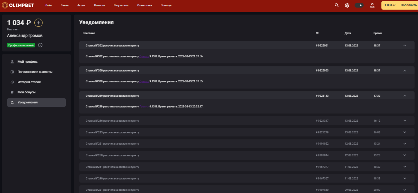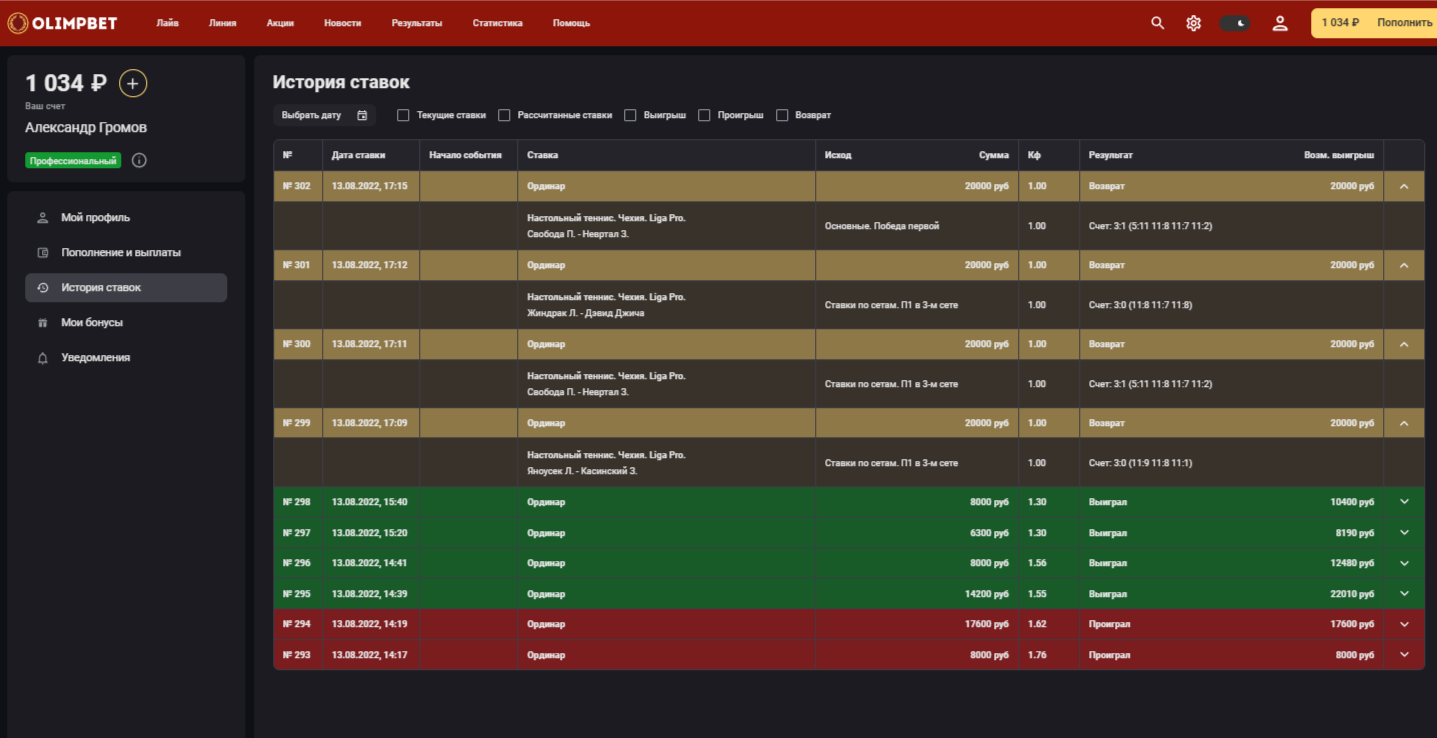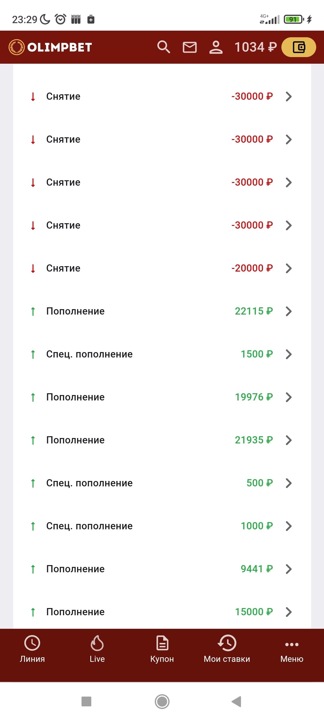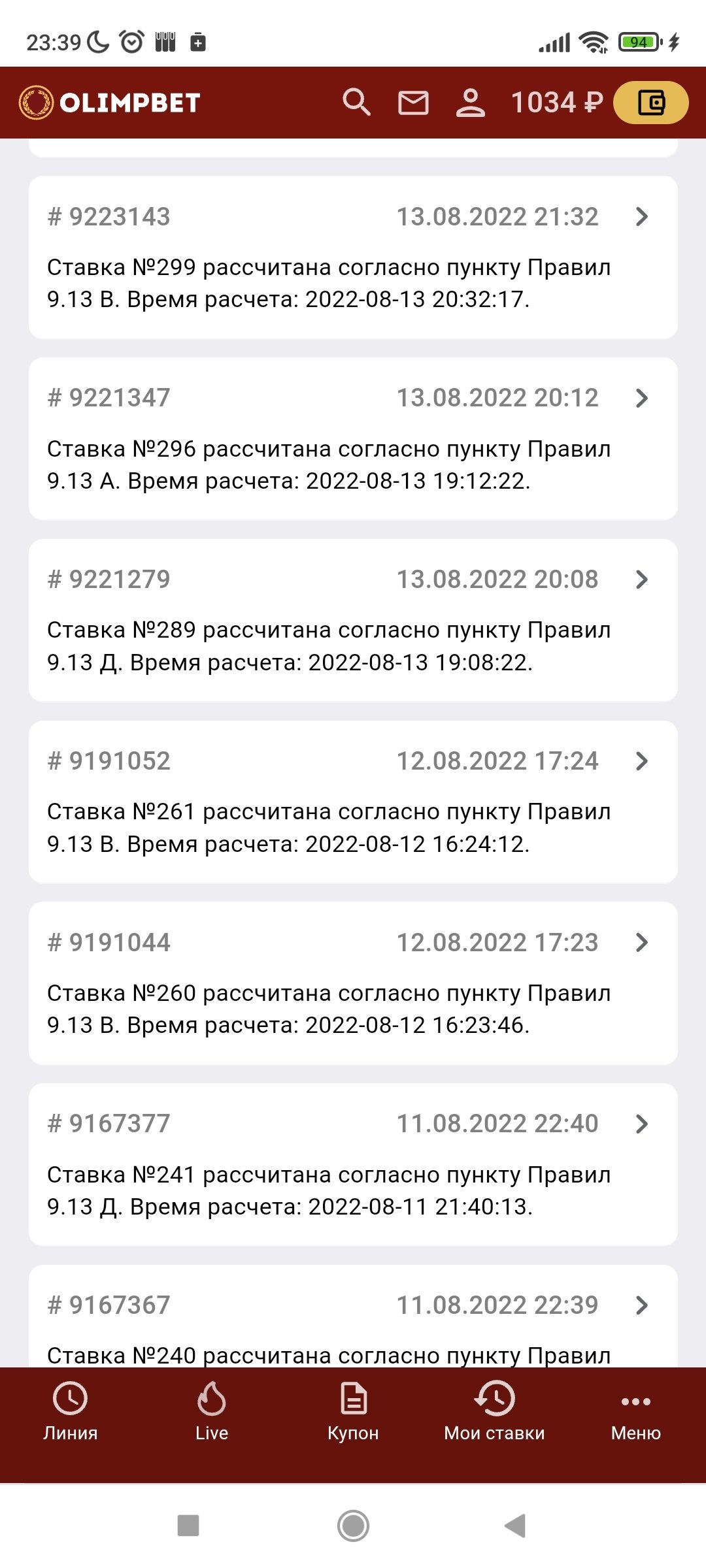 Здравствуйте, . 2022 спокойным образом делал ставки😌, в числе которых ставки под номерами 299, 300, 301 и 302, выделяю их отдельно, поскольку все началось с них. Данные ставки делал по система флэт, на каждых исход была сделана ставка в 20 тысяч рублей. Все они оказались выигрышными, хотя одна чуть не проиграла, в остальных уверенные выигрыши, по итогу их рассчитали, на моем балансе было 123 тысячи рублей+🎊🍾 (не успел запомнить до рубля, далее поймете по чему). Далее начинается веселье. Одну из ставок пересчитывают с коэффициентом 1 — возврат…😒 Обидно ? — обидно, но я играю на Олимпе не первый день и пару раз уже были таки инциденты, но не на такие суммы, да и я только что выиграл за вычетом перерасчета порядка 40 тысяч рублей, знаете, чувство радости было сильнее 🤑🤑🤑..., но не буду отвлекаться, продолжу рассказ. Пишу в СП: Служба поддержки ссылается на пункт правил " А", " В" и " Д" (о " А" и " Д" позже) был ли он там ? — НЕТ❗️, не врите ни мне, ни себе, матчи были в live, за одним вообще следил все сеты, коэффициенты прыгали вверх вниз, пока не поставил "принять при повышении", ставки не принимались, ставки выиграли, исходы я выбирал не какие-нибудь нетипичные, вроде: "В какой руке игрок №1 будет крутить ракетку", где возможен «глюк», ошибка или что-то им подобное, а победы в матчах и сетах🤬🤬🤬. Имейте уважение к игроку, я молчал когда вы просто произвольно по своему усмотрению коэффициенты меняли, но когда так в наглую и в ряд терпения уже никакого нет! К тому же это именно предвзятое отношение, поскольку изначально все началось с возвратов, а не перерасчетов! Читайте дальше! Далее ставлю на вывод 70 тысяч рублей, на балансе остается чуть больше 40 тысяч рублей и убираю телефон и компьютер в сторонку отправляясь заниматься делами по дому, для моего аккаунта в этом нет никаких сверх сумм🤷♂️, поскольку пополнял зачастую на большие суммы, были не единожды пополнения и на 20 с чем-то тысяч рублей, да и выводы были по 30 тысяч рублей, к которым БК "Олимп" не проявлял никакого интереса, если можно так выразиться, к тому же, днем 13. 08. 2022 г. на балансе было 50 333 рубля (эту сумму помню точно и ясно, потому что три тройки в ряд отлично откладываются в памяти). Через какое-то время думаю🤔, выиграл сегодня и выиграл хорошо (думаю всем читающим знакомо это чувство, оно нерационально и попахивает лудоманией, знаю об этом… но данное наваждение меня обуяло), можно еще зарядить несколько, в любом случае в минусе не буду, могу еще дважды по 20 тысяч рублей поставить (70 на выводе на балансе 40+, сегодня игрок в выигрыше ). И что вы думаете? — куча уведомлений о перерасчете ставок, в числе которых выше упомянутые…🤬 Где большие суммы (ставки под номерами: 299, 300, 301 и 302, говорил о них выше) "впаяли" В, где меньше А и Д! А знаете, когда они закончились ? — когда они довели баланс моего личного кабинета до 1034 рублей🤬🤬🤬❗️❗️❗️ А затем сразу все прекратилось как так и надо, так и положено🤦♂️. Дальше больше!!! Мне отменяют вывод на 70 тысяч рублей и планомерно продолжают изничтожать мой баланс, до 1034 рублей!!! Уведомления о перерасчетах начались с размена четвертой сотни, а закончились перерасчетами ставок третьей сотни🤬! Единственно не написали мне с претензией о моих выигрышах, хотя честно говоря, я бы и не удивился😔. Все могу понять, но БК Олимп повела себя по отношению ко мне недобросовестно, если выра