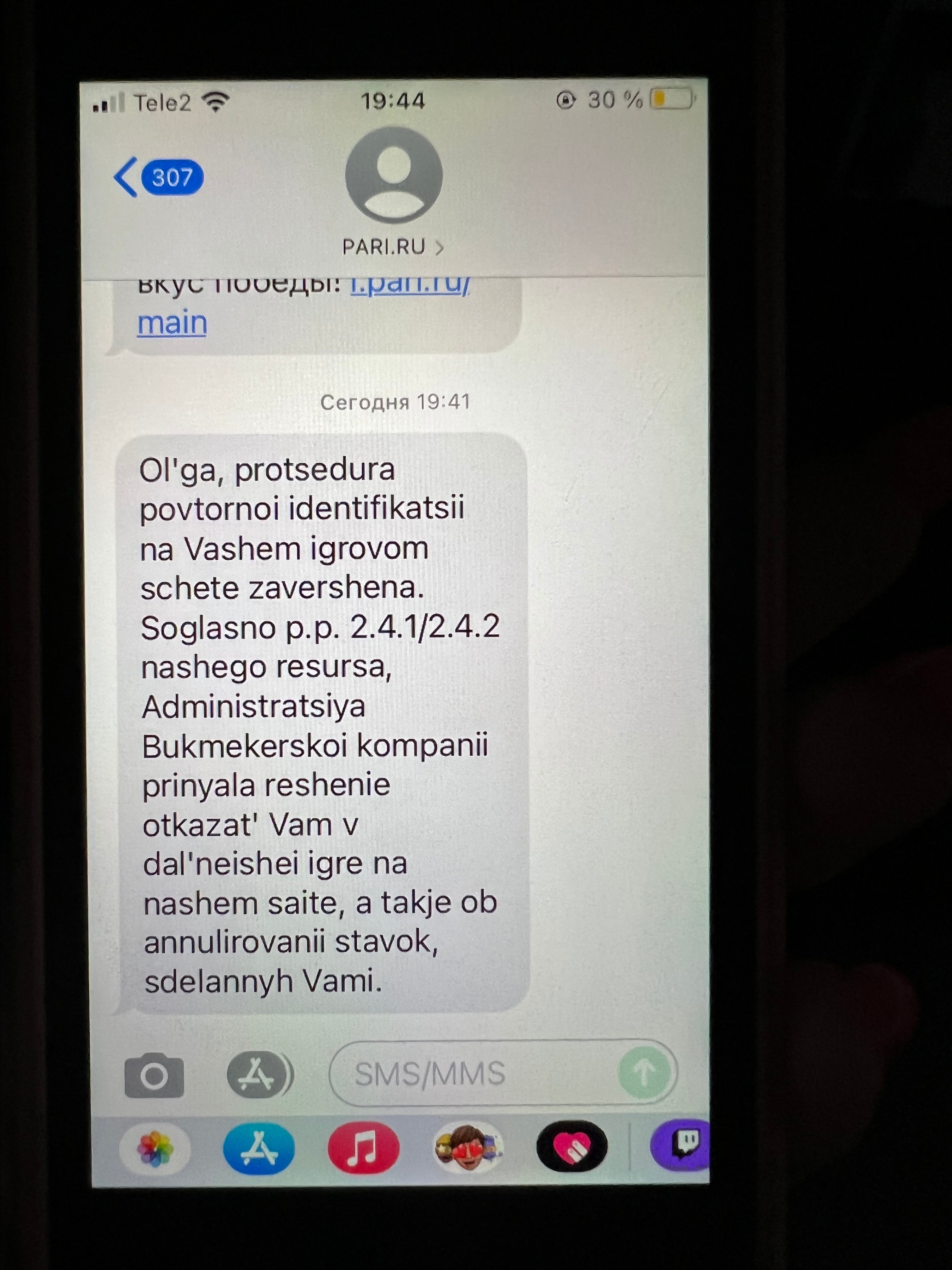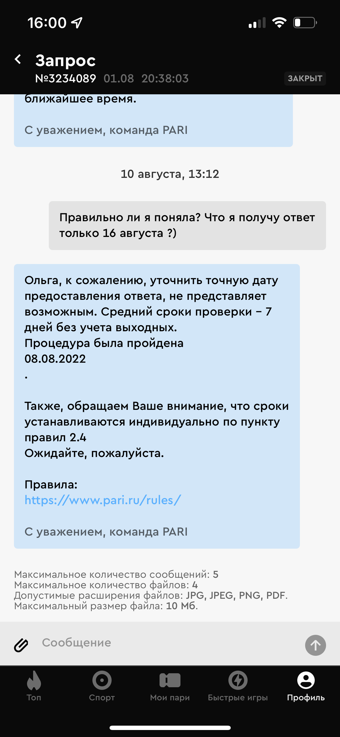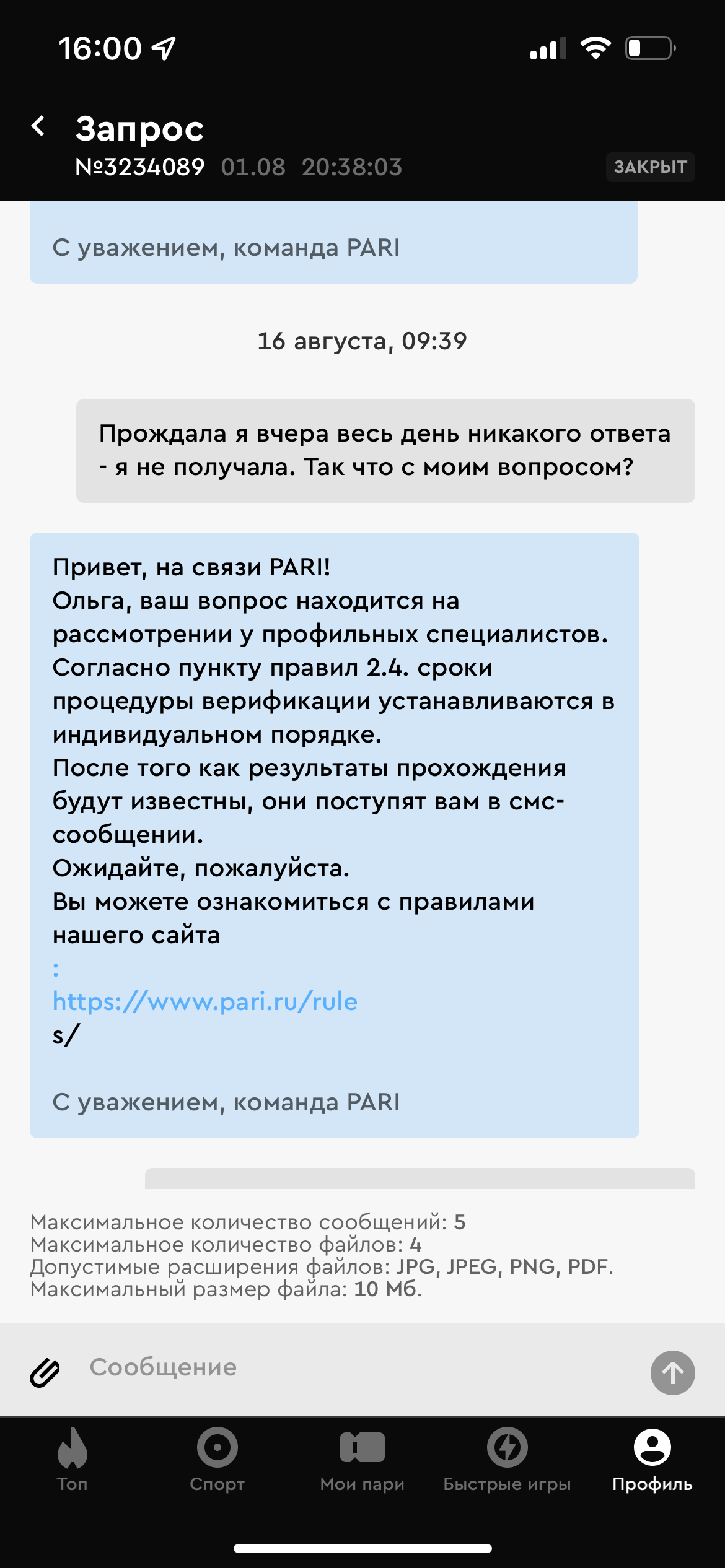 Добрый день. Делала ставки в парибет, все устраивало. До конкретного момента. Не одобрили вывод. Отправили на вторую верификацию. Сроки в среднем 7 рабочих дней. Сроки истекли. Постоянно ссылаются на пункт 2.4. Конкретных ответов не дают, жду с 1 августа уже. Помогите,пожалуйста, решить проблему.