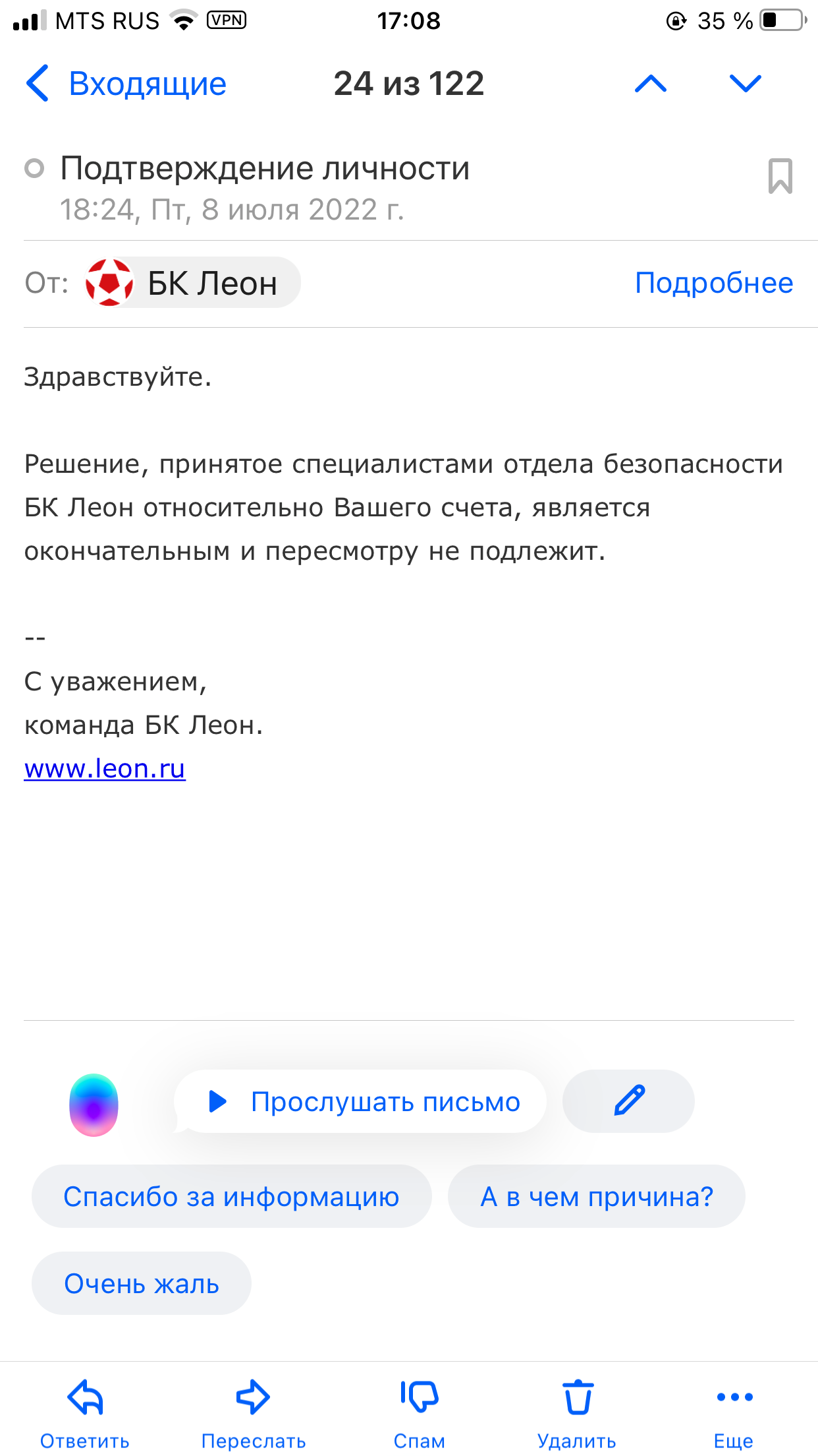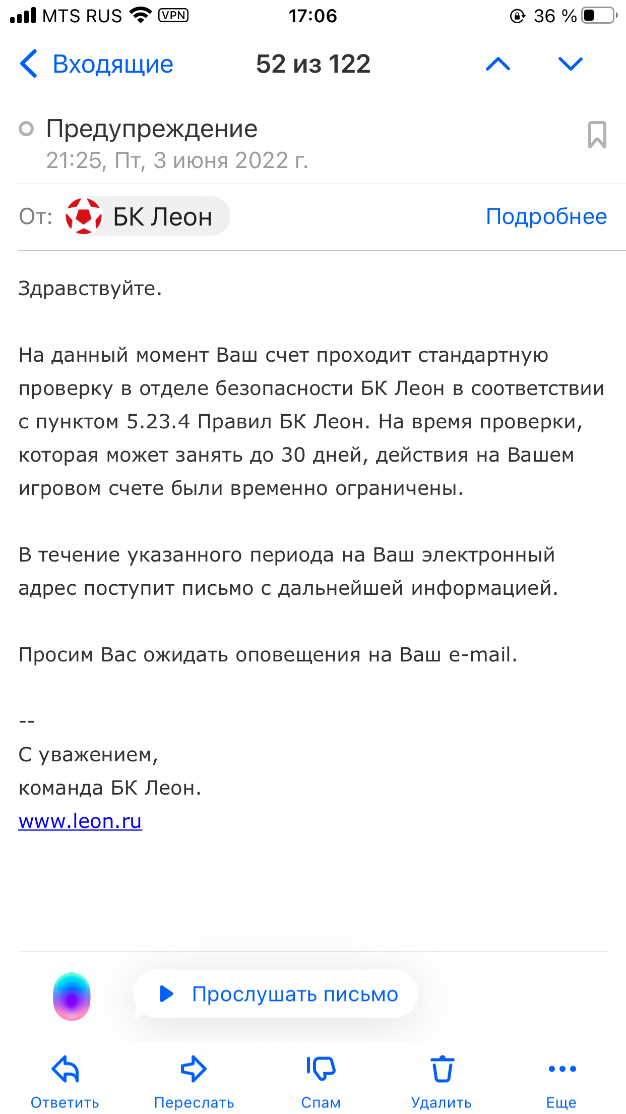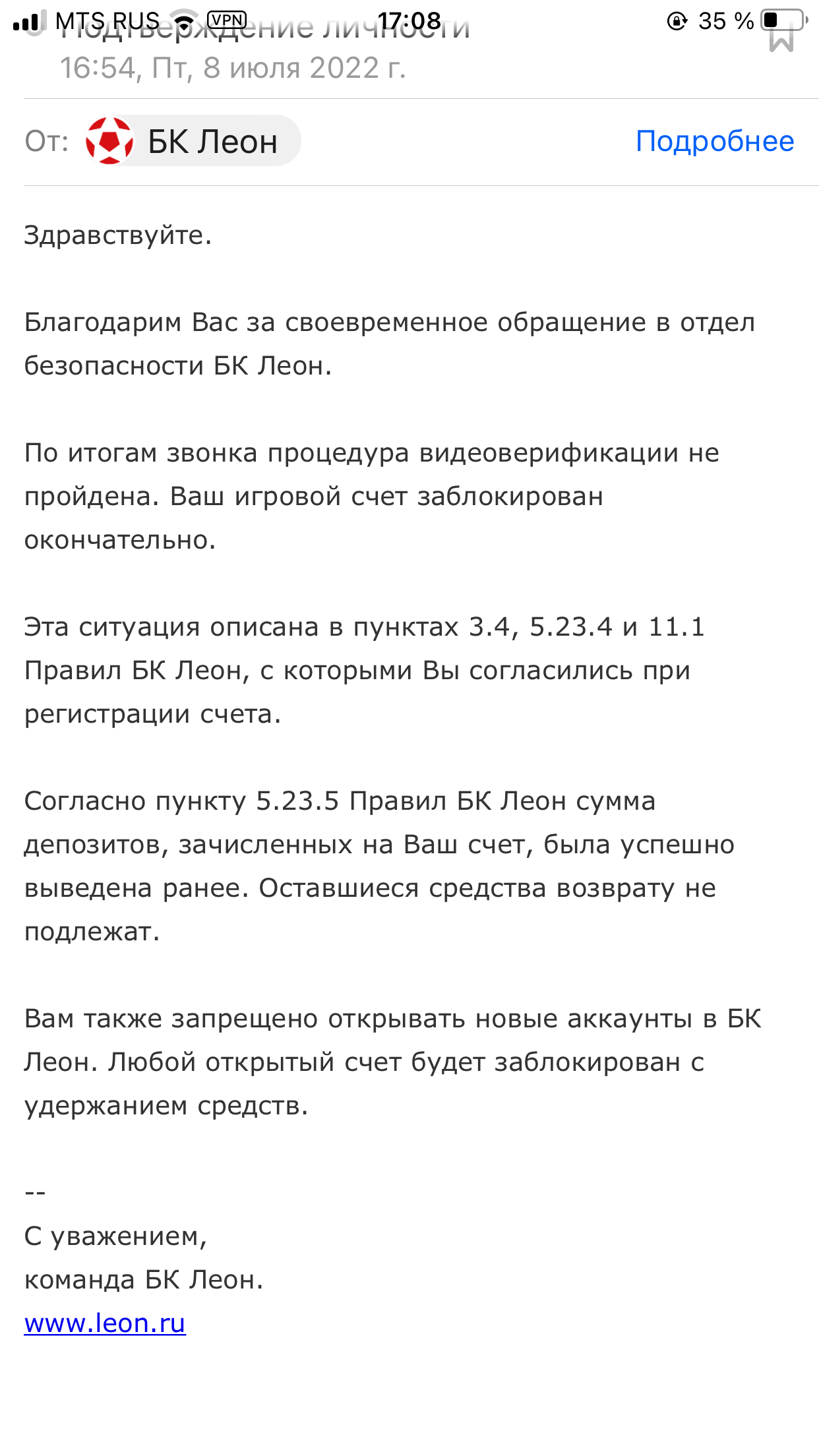 Здравствуйте Легалбет, помогите пожалуйста решить проблему, Бк Леон заблокировали мне аккаунт, и не дали вывести мой выигрыш, я участвовала в акции в которой за каждое пополнение на 500 рублей, давалась 1000 фрибетов, с этих 1000 фрибетов у меня выиграла ставка с коэффициентом 10, чтобы выигрыш был зачислен на основной счёт, его нужно было отыграть проставив 10 ставок по 500 рублей, я его отыграла и мне зачислили эти фрибеты на основной счёт, когда я захотела вывести эти деньги, мне сразу заблокировали вывод средств, начались проверки, сначала нужно было пройти верификацию, хотя я ее уже проходила когда создавала счёт, фото паспорта, моего лица на фоне паспорта, банковская карточка с которой были пополнения, все эти проверки длились месяц, все данные были предоставлены сразу по требованию БК, все проверки успешно были пройдены и на последок нужно было пройти видеоверификацию, мне задавали кучу вопросов: когда был создан аккаунт, какие ставки и на что были поставлены, притом что историю ставок они уже удалили и только через месяц сделали эту видеоконференцию, но я на все вопросы отвечала, что такое фора, сколько человек играют в контрстрайк и т.д , я на все ответила. Некоторые ставки мне помогал делать муж, я им так и сказала, все ставки были сделаны с моего телефона, с одного устройства! После видеоконференции пришёл ответ что мой счёт заблокирован и решение обжалованию не подлежит. Легалбет помогите пожалуйста, иначе как беспределом я это назвать не могу.