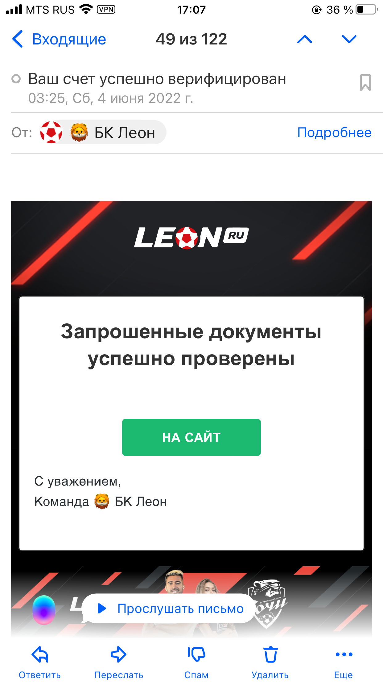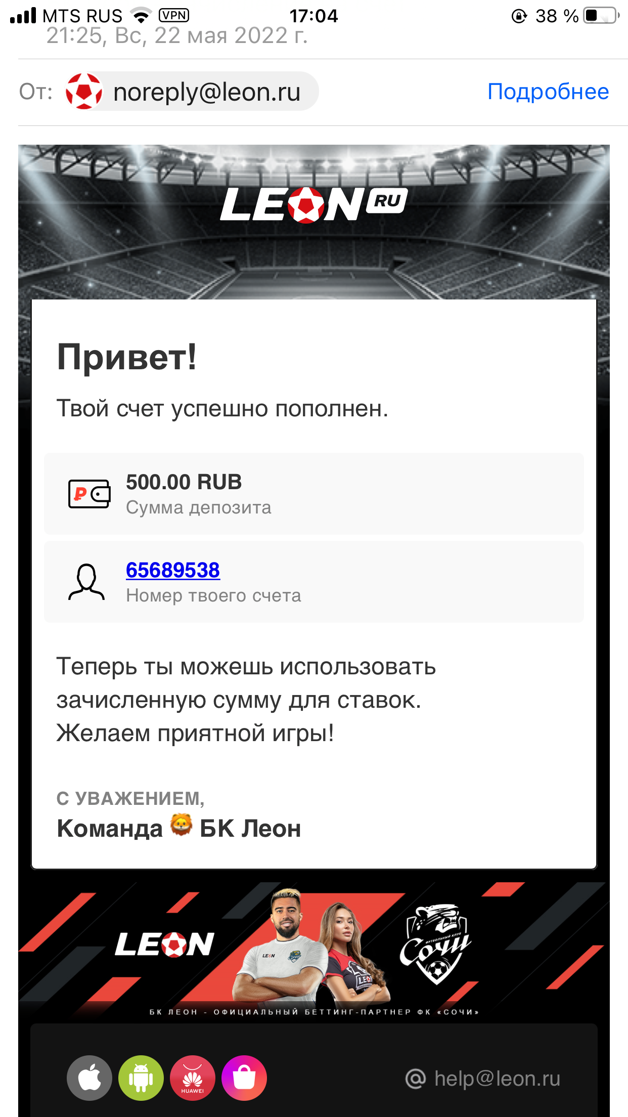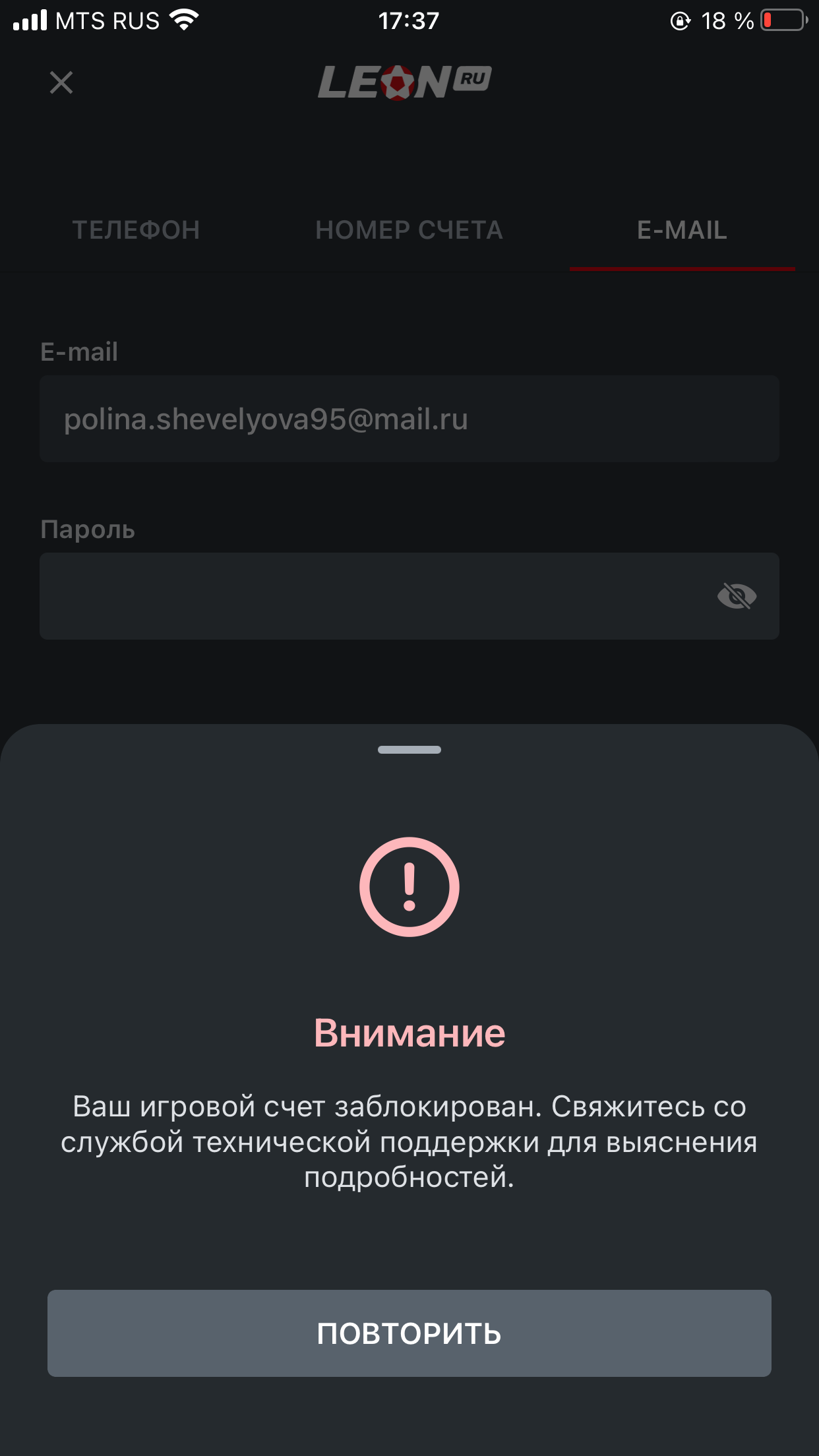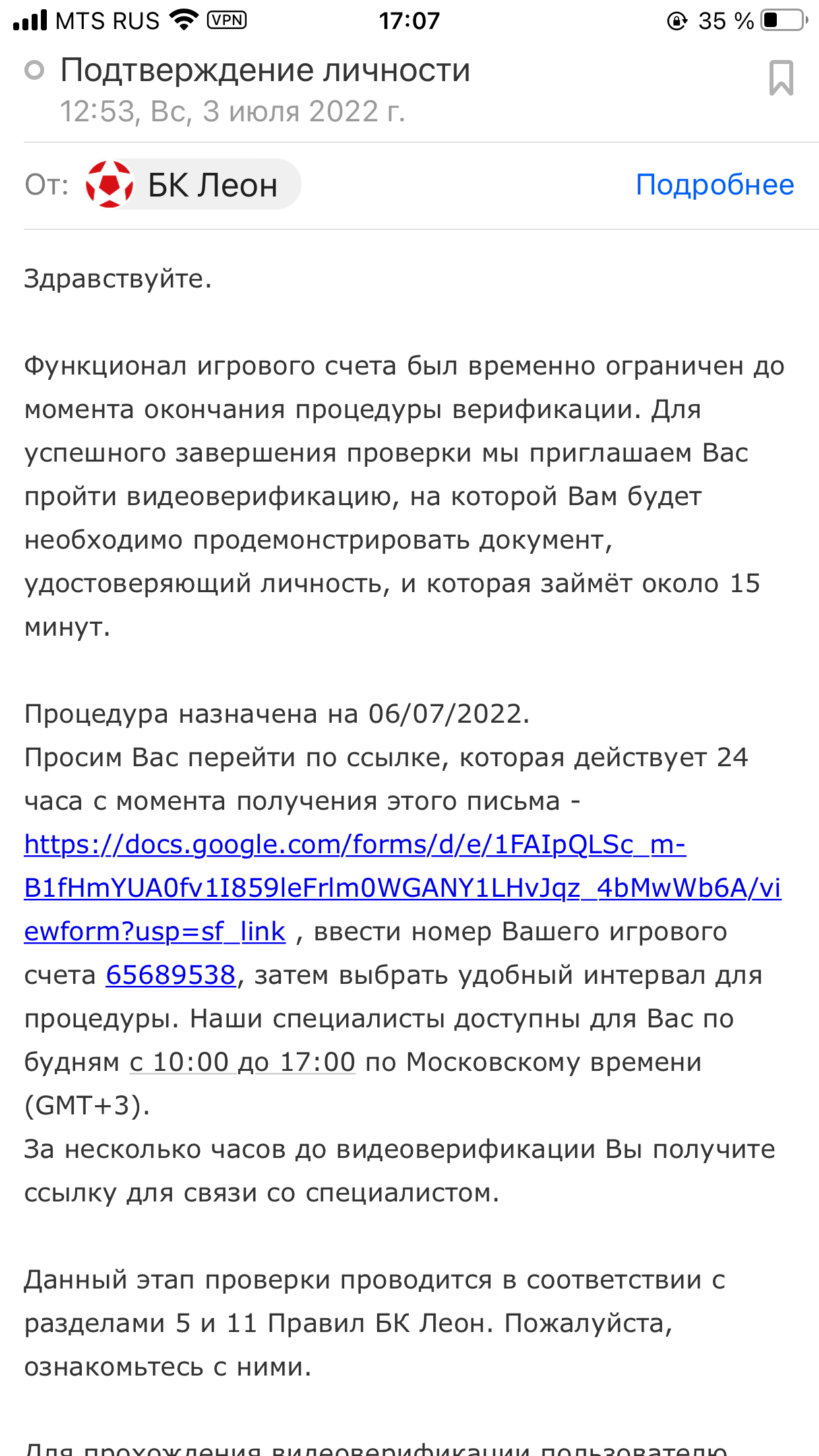 Здравствуйте Легалбет, помогите пожалуйста решить проблему, Бк Леон заблокировали мне аккаунт, и не дали вывести мой выигрыш, я участвовала в акции в которой за каждое пополнение на 500 рублей, давалась 1000 фрибетов, с этих 1000 фрибетов у меня выиграла ставка с коэффициентом 10, чтобы выигрыш был зачислен на основной счёт, его нужно было отыграть проставив 10 ставок по 500 рублей, я его отыграла и мне зачислили эти фрибеты на основной счёт, когда я захотела вывести эти деньги, мне сразу заблокировали вывод средств, начались проверки, сначала нужно было пройти верификацию, хотя я ее уже проходила когда создавала счёт, фото паспорта, моего лица на фоне паспорта, банковская карточка с которой были пополнения, все эти проверки длились месяц, все данные были предоставлены сразу по требованию БК, все проверки успешно были пройдены и на последок нужно было пройти видеоверификацию, мне задавали кучу вопросов: когда был создан аккаунт, какие ставки и на что были поставлены, притом что историю ставок они уже удалили и только через месяц сделали эту видеоконференцию, но я на все вопросы отвечала, что такое фора, сколько человек играют в контрстрайк и т.д , я на все ответила. Некоторые ставки мне помогал делать муж, я им так и сказала, все ставки были сделаны с моего телефона, с одного устройства! После видеоконференции пришёл ответ что мой счёт заблокирован и решение обжалованию не подлежит. Легалбет помогите пожалуйста, иначе как беспределом я это назвать не могу.