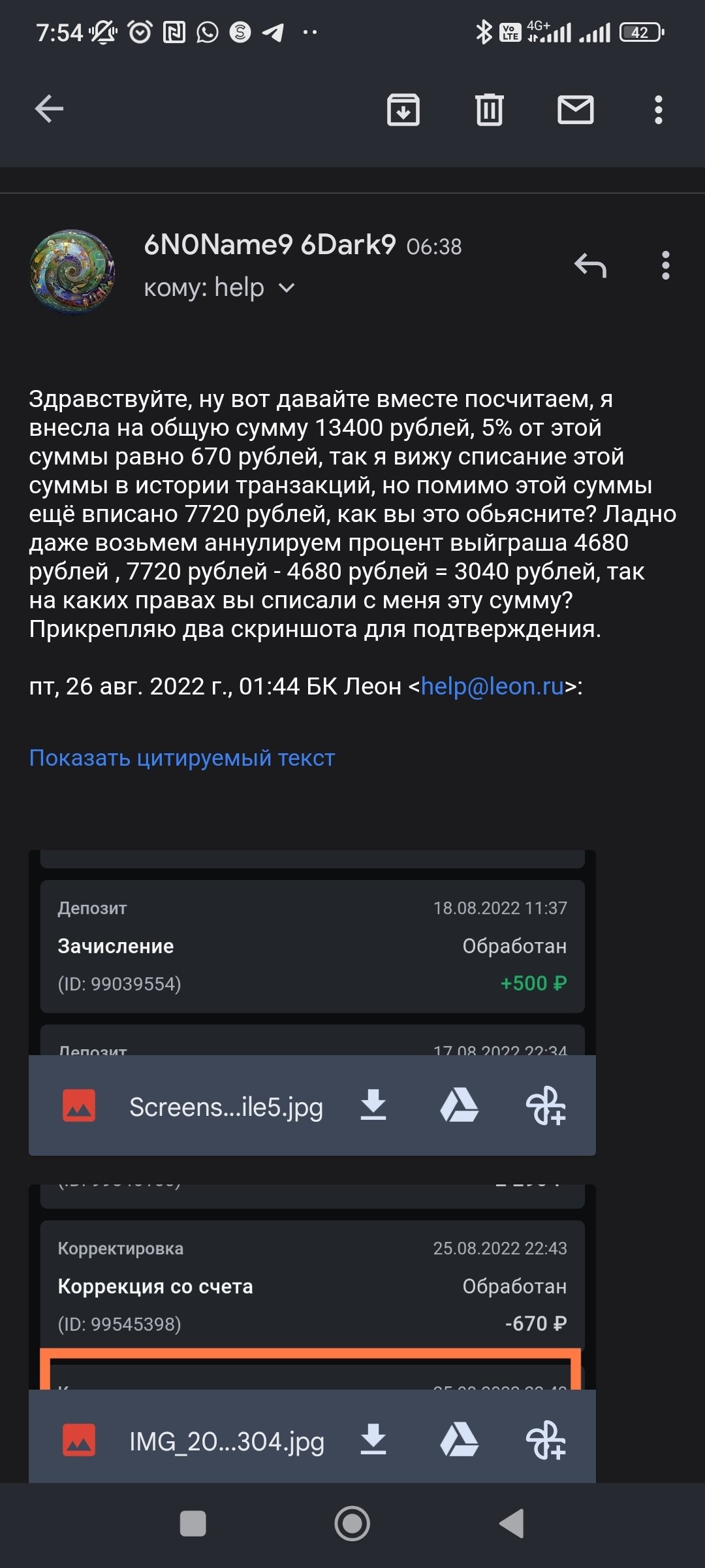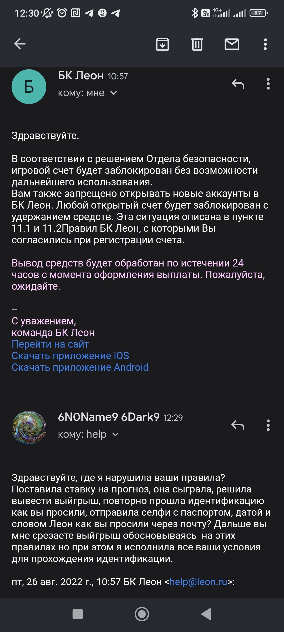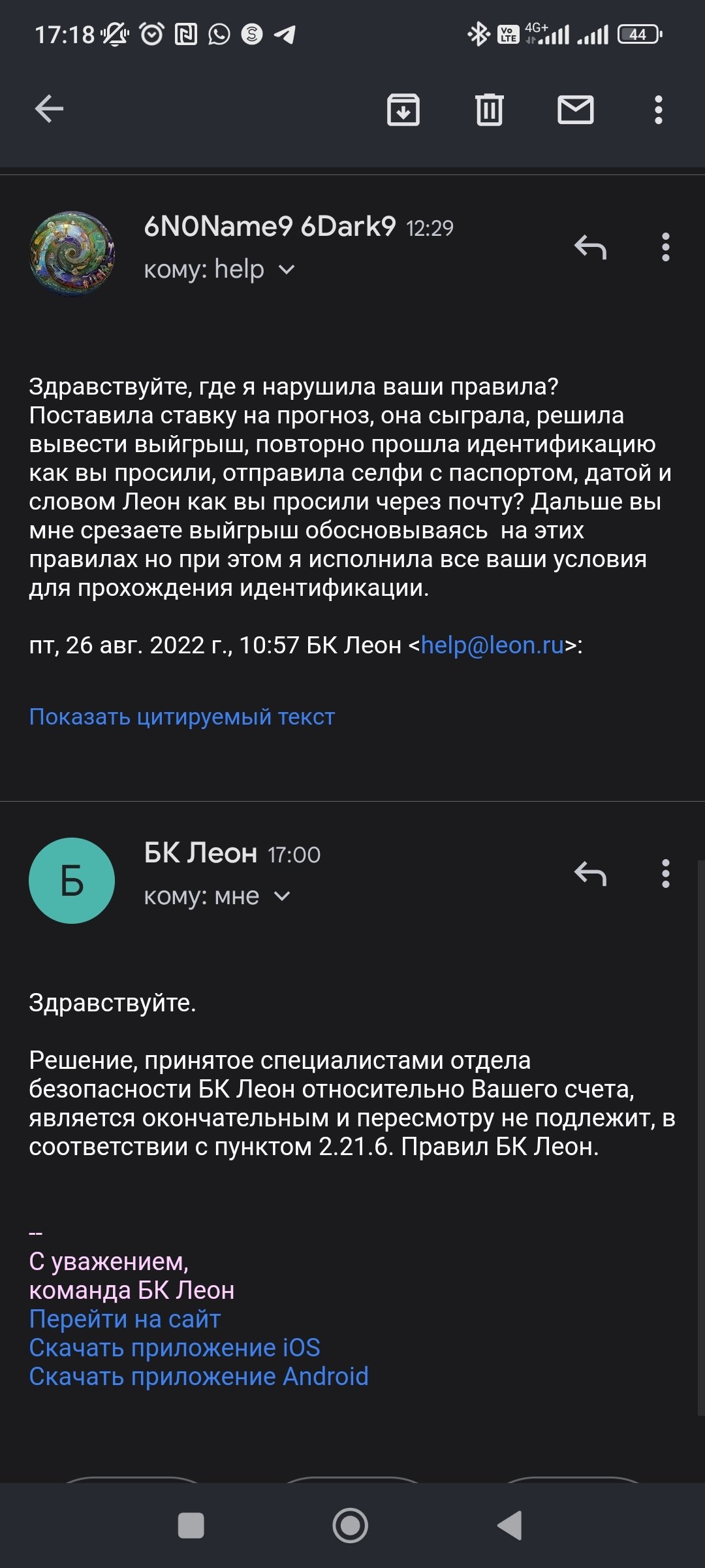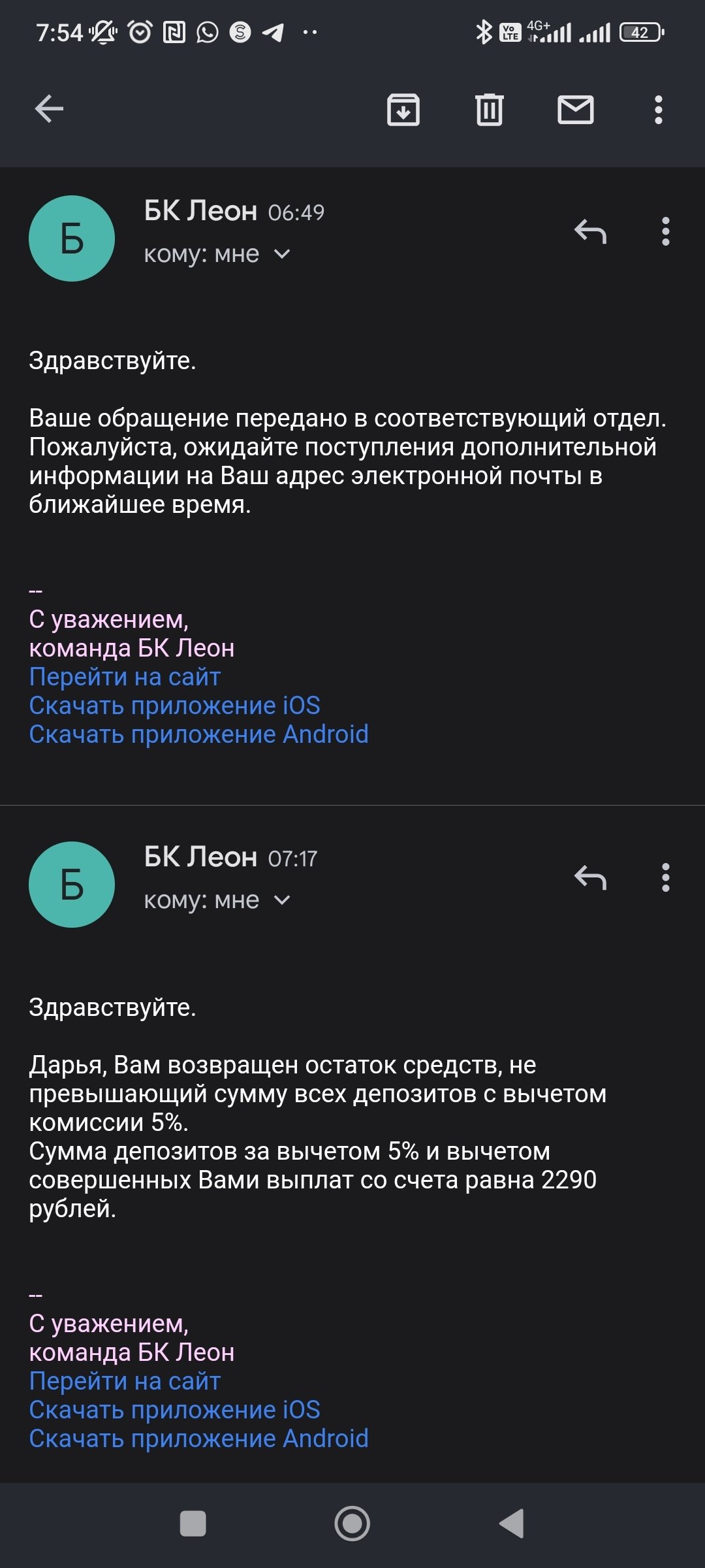 Здравствуйте, завела на счёт 66005811 сумму в размерн 6000 тысяч рублей, решила испытать удачу, до этого все было хорошо, аккаунт верификацию прошёл, уже один раз вывела выйгрыш, остальные разы проиграла а вот сегодня когда ставка сыграла и с 6000 тысяч, я выйграла 10680, обрадовалась, но когда захотела вывести средства со счета, у меня запросили заново пройти идентификацию, мне показалось странным так как уже отправляла им снимок паспорта и селфи, ну на первый взгляд подумала, может глюк, все сделала, как просили чёткое фото со всеми данными, после жду одобрения, в итоге приходит сообщение об ошибке и с просьбой обратиться в поддержку БК Леон.По ошибке написала со своей другой почты, объяснила ситуацию и прикрепила селфи с паспортом, номером счета и датой.в итоге отвечают что напишите с другой той которая прикреплена к вашей учётной записи, но в этот момент захожу на свою учётную запись на БК и вижу что мой выйгрыш 10680 рублей,превратился в 2290 рублей и приходит уведомление на почту о блокировке аккаунта и что вам будет возращен остаток средств со счета не превышающий сумму всех депозитов с вычетом комиссии 5% согласно .5 правил бк Леон. Первый вопрос как получается от 6000 рублей с вычетом 5% сумма равная 2290 рублей? Второй момент и самый главный ,я им отписалась сразу с той почты(привязанная к моей учётной записи на БК Леон) как увидела сообщение на другой почты с которой по ошибке написала им, ввела с ними разговор, сообщила что по ошибке написала с другой, на вопрос почему от 6000 тысяч рублей мне возращается только 2290 рублей они мне не отвечают а по поводу блокировки счёта они приняли окончательное решение которое не подлежит рассмотрению.Пожалуйста помогите разобраться, я ничего не нарушала и миллион у них не выйграла чтобы поступить так из за выйграша в сумме не привышающую 5 тысяч рублей.