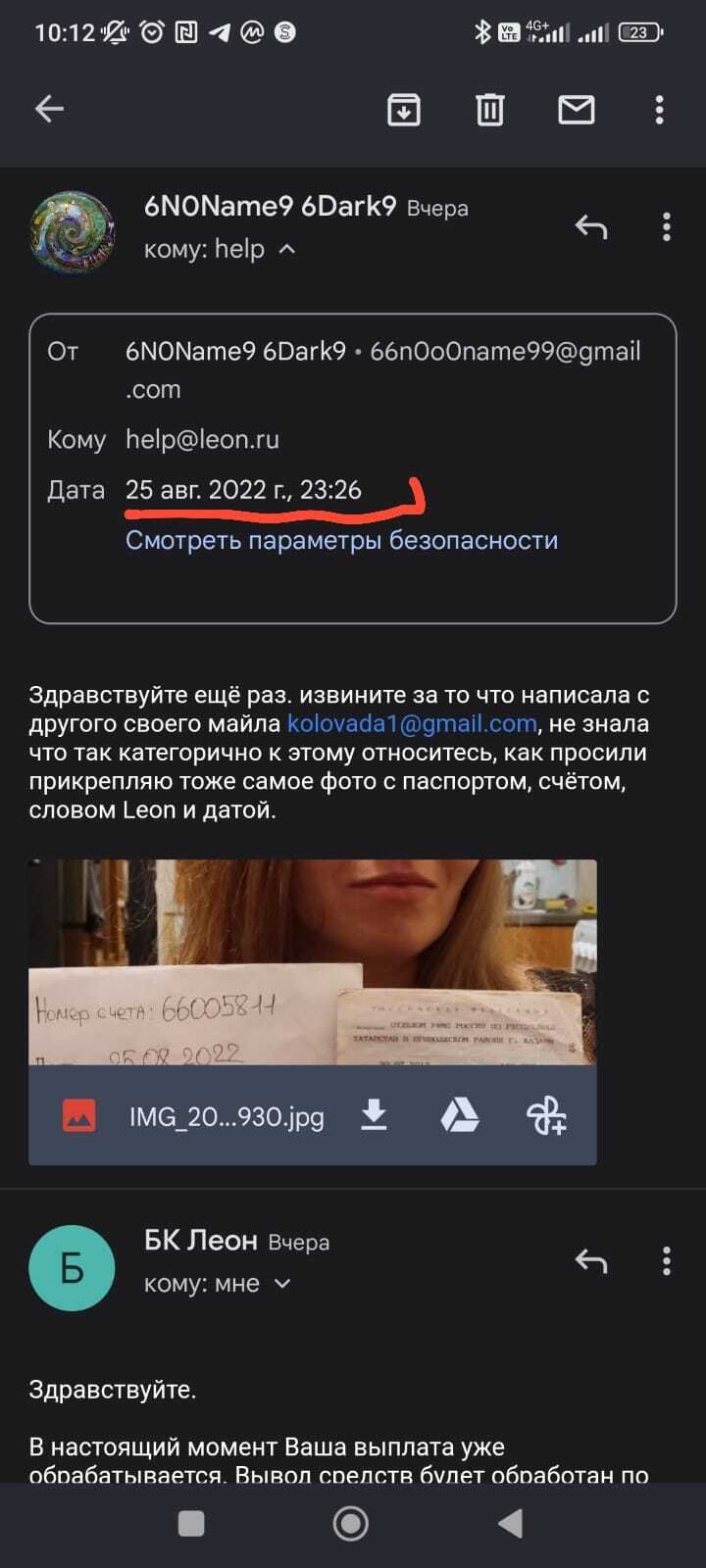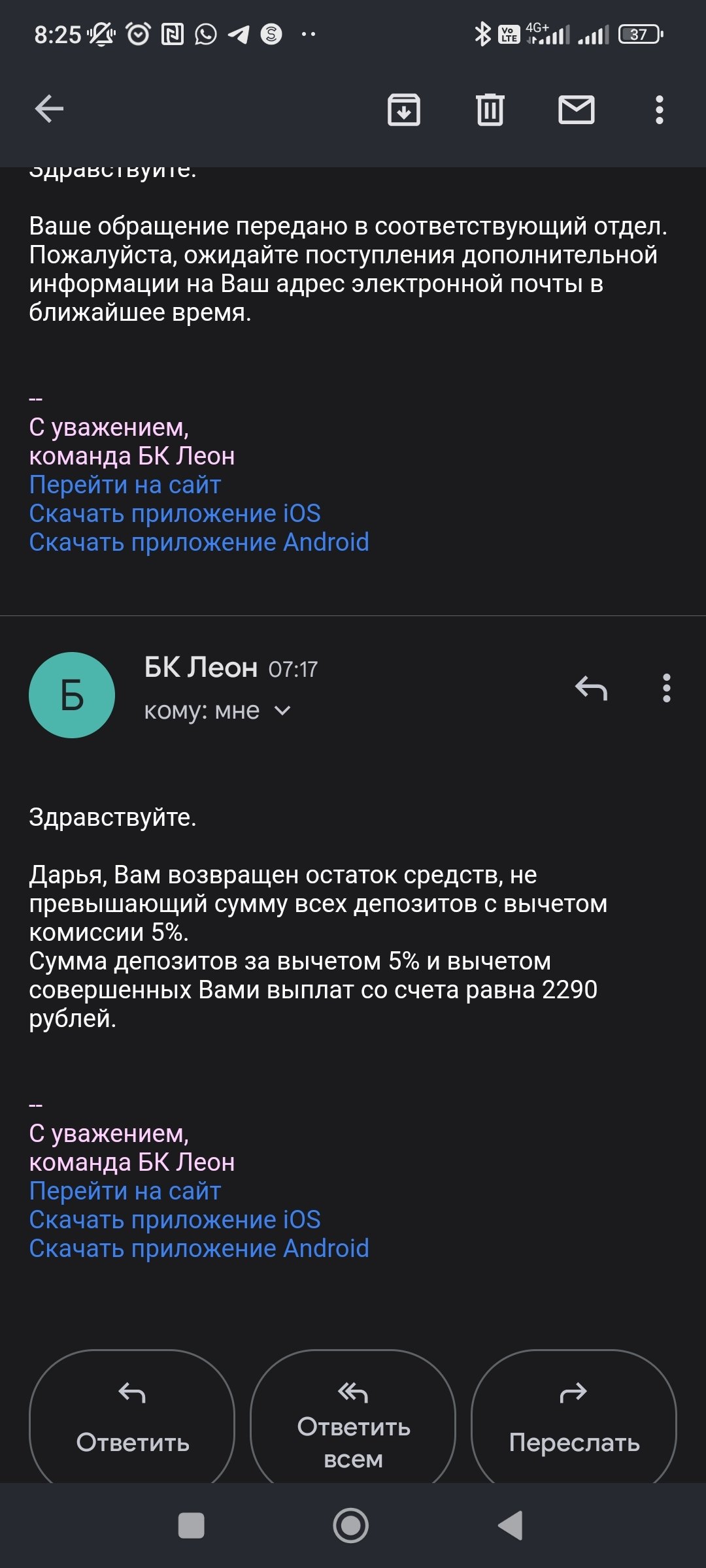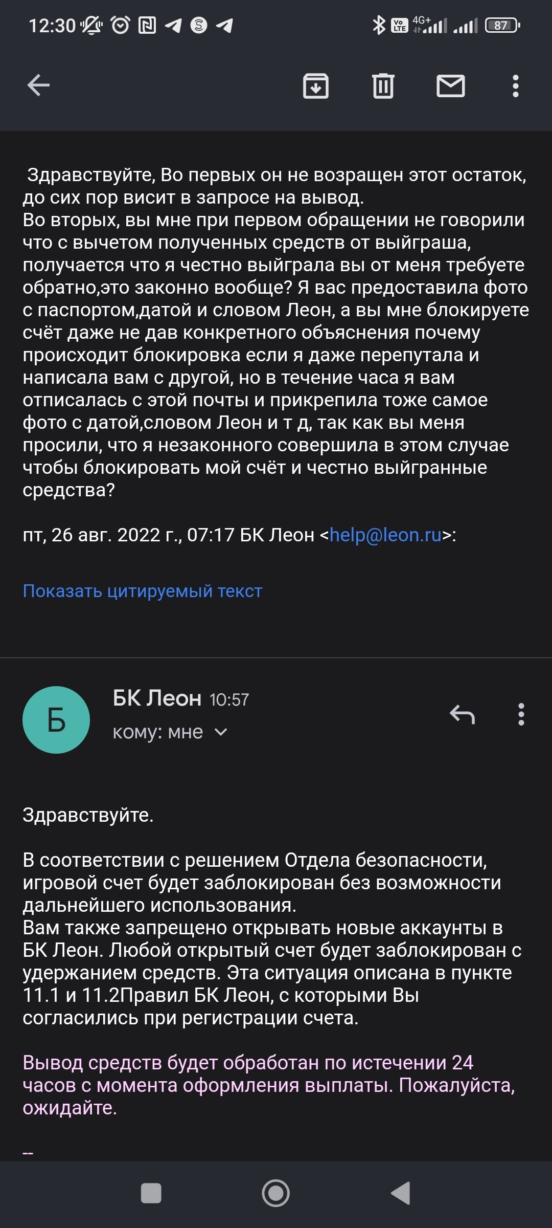 Здравствуйте, завела на счёт 66005811 сумму в размерн 6000 тысяч рублей, решила испытать удачу, до этого все было хорошо, аккаунт верификацию прошёл, уже один раз вывела выйгрыш, остальные разы проиграла а вот сегодня когда ставка сыграла и с 6000 тысяч, я выйграла 10680, обрадовалась, но когда захотела вывести средства со счета, у меня запросили заново пройти идентификацию, мне показалось странным так как уже отправляла им снимок паспорта и селфи, ну на первый взгляд подумала, может глюк, все сделала, как просили чёткое фото со всеми данными, после жду одобрения, в итоге приходит сообщение об ошибке и с просьбой обратиться в поддержку БК Леон.По ошибке написала со своей другой почты, объяснила ситуацию и прикрепила селфи с паспортом, номером счета и датой.в итоге отвечают что напишите с другой той которая прикреплена к вашей учётной записи, но в этот момент захожу на свою учётную запись на БК и вижу что мой выйгрыш 10680 рублей,превратился в 2290 рублей и приходит уведомление на почту о блокировке аккаунта и что вам будет возращен остаток средств со счета не превышающий сумму всех депозитов с вычетом комиссии 5% согласно .5 правил бк Леон. Первый вопрос как получается от 6000 рублей с вычетом 5% сумма равная 2290 рублей? Второй момент и самый главный ,я им отписалась сразу с той почты(привязанная к моей учётной записи на БК Леон) как увидела сообщение на другой почты с которой по ошибке написала им, ввела с ними разговор, сообщила что по ошибке написала с другой, на вопрос почему от 6000 тысяч рублей мне возращается только 2290 рублей они мне не отвечают а по поводу блокировки счёта они приняли окончательное решение которое не подлежит рассмотрению.Пожалуйста помогите разобраться, я ничего не нарушала и миллион у них не выйграла чтобы поступить так из за выйграша в сумме не привышающую 5 тысяч рублей.