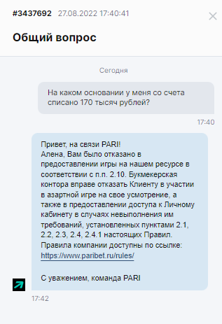 Номер счета 19174295. Списан весь выигрыш,все 1700000 рублей.Удивительно,но сделав такое Пари никак это не объясняет кроме общих фраз.Верните деньги