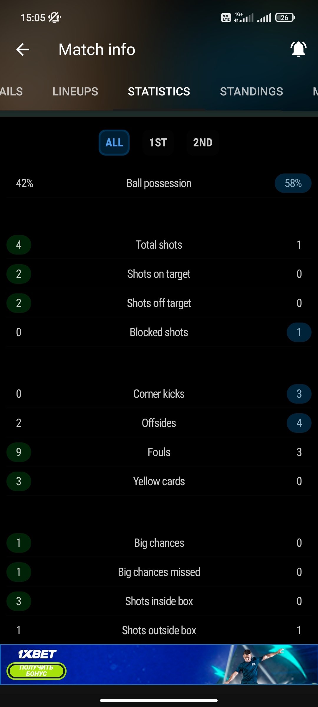 Первый скриншот к началу второго тайма с приложения спортивной статистики, второй скриншот был предоставлен букмекером - совершенно нечитаемый