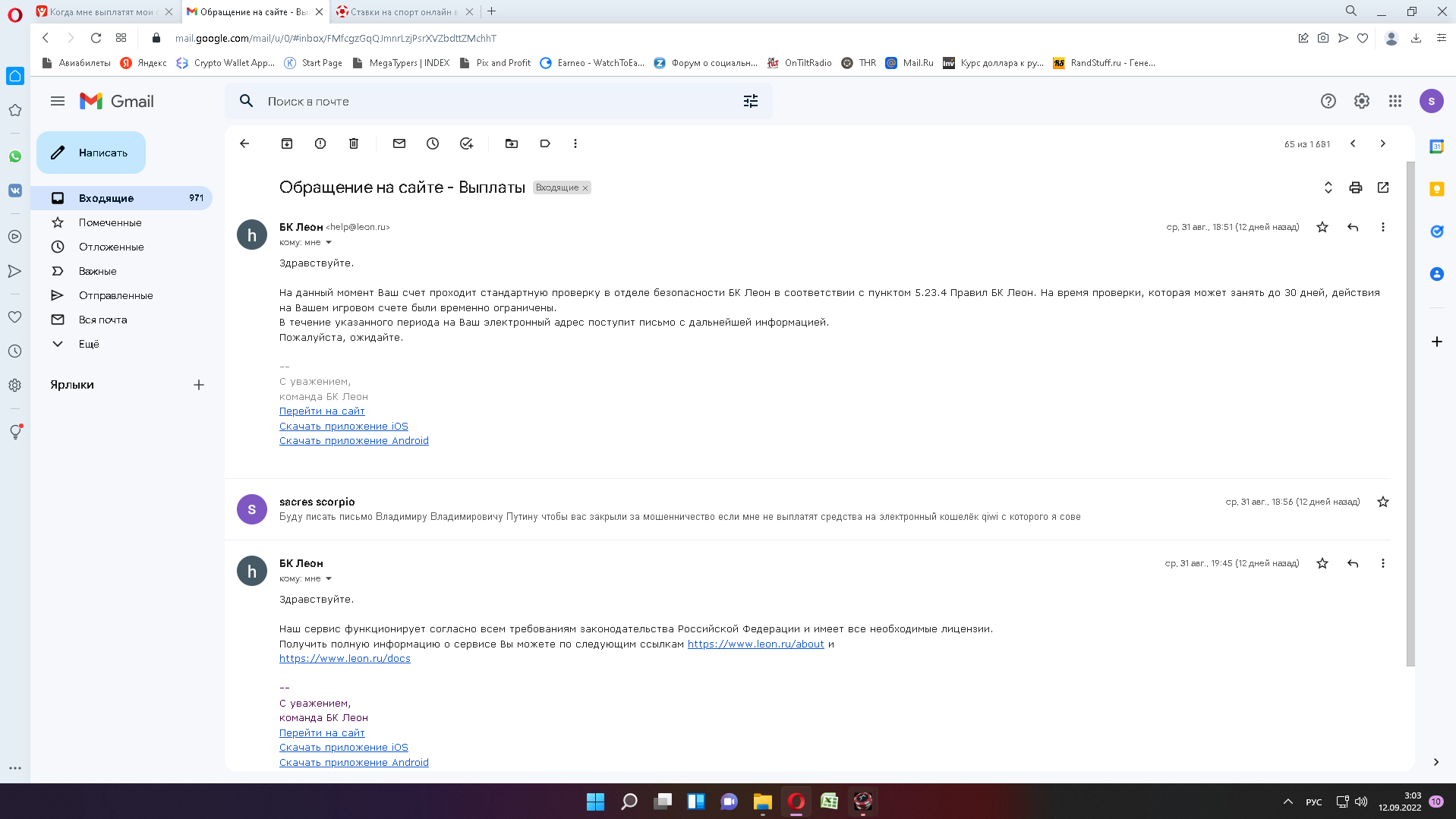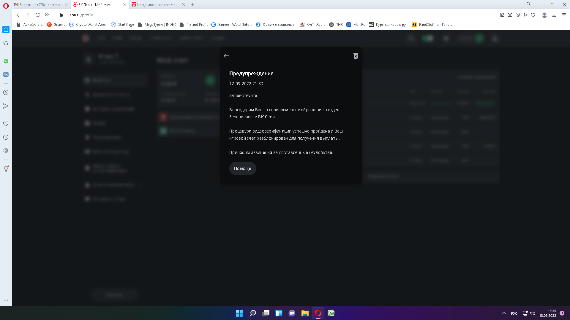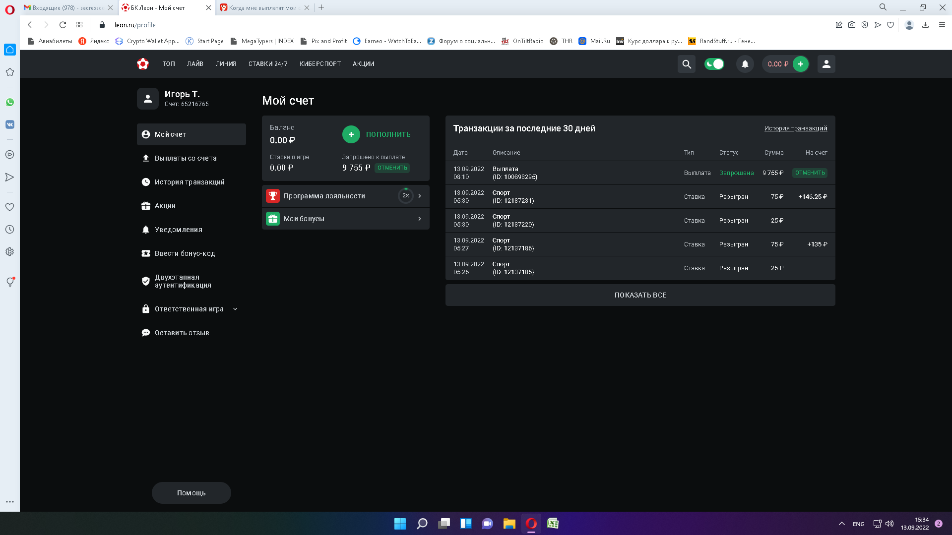 номер счёта Счет: 65216765 в бк конторе leon при заказе выплаты денежных средств прошёл верификацию и фейс верификацию поставил выплату 9250 рублей отклонили прислали вот такое письмо Здравствуйте. На данный момент Ваш счет проходит стандартную проверку в отделе безопасности БК Леон в соответствии с пунктом .4 Правил БК Леон. На время проверки, которая может занять до 30 дней, действия на Вашем игровом счете были временно ограничены. В течение указанного периода на Ваш электронный адрес поступит письмо с дальнейшей информацией. Просим Вас ожидать оповещения на Ваш e-mail. прошла уже целая неделя не могу вывести деньги удалили историю ставок историю пополнений