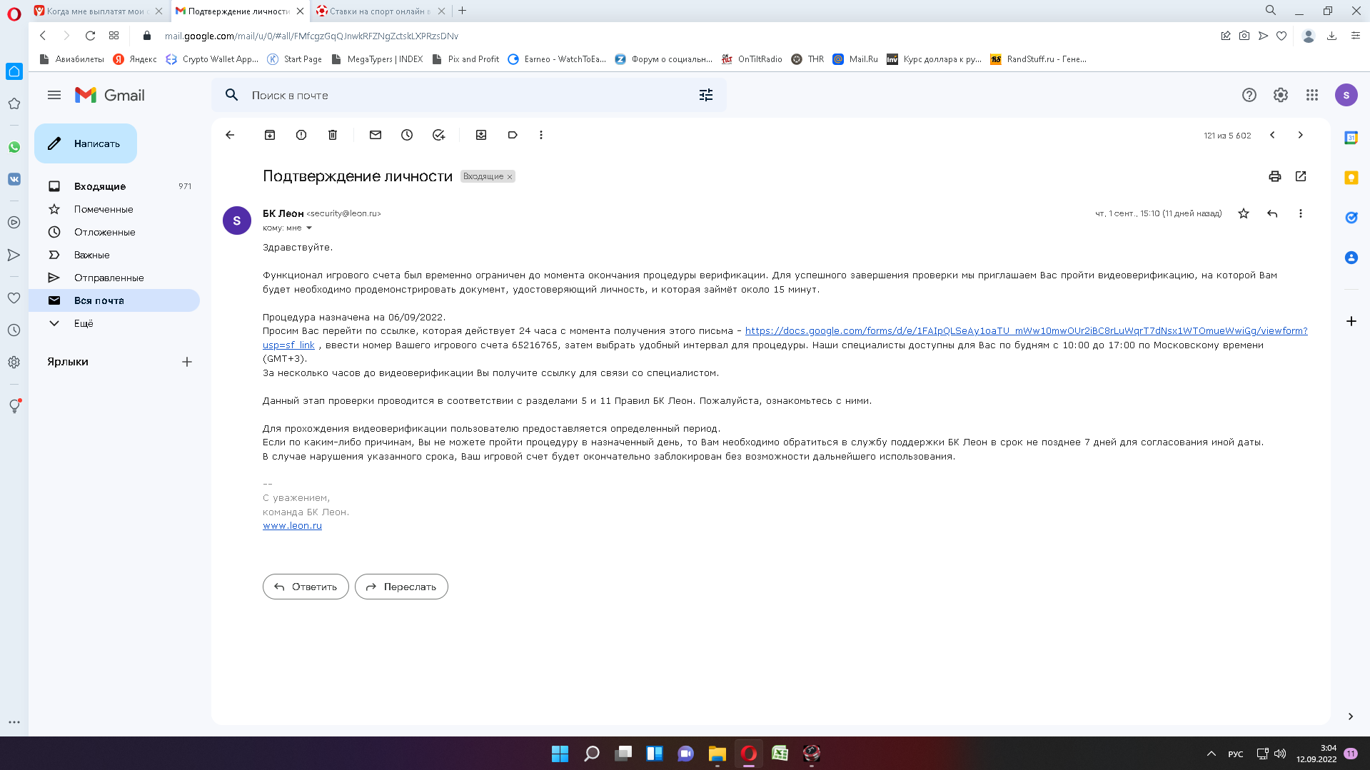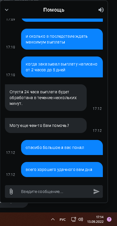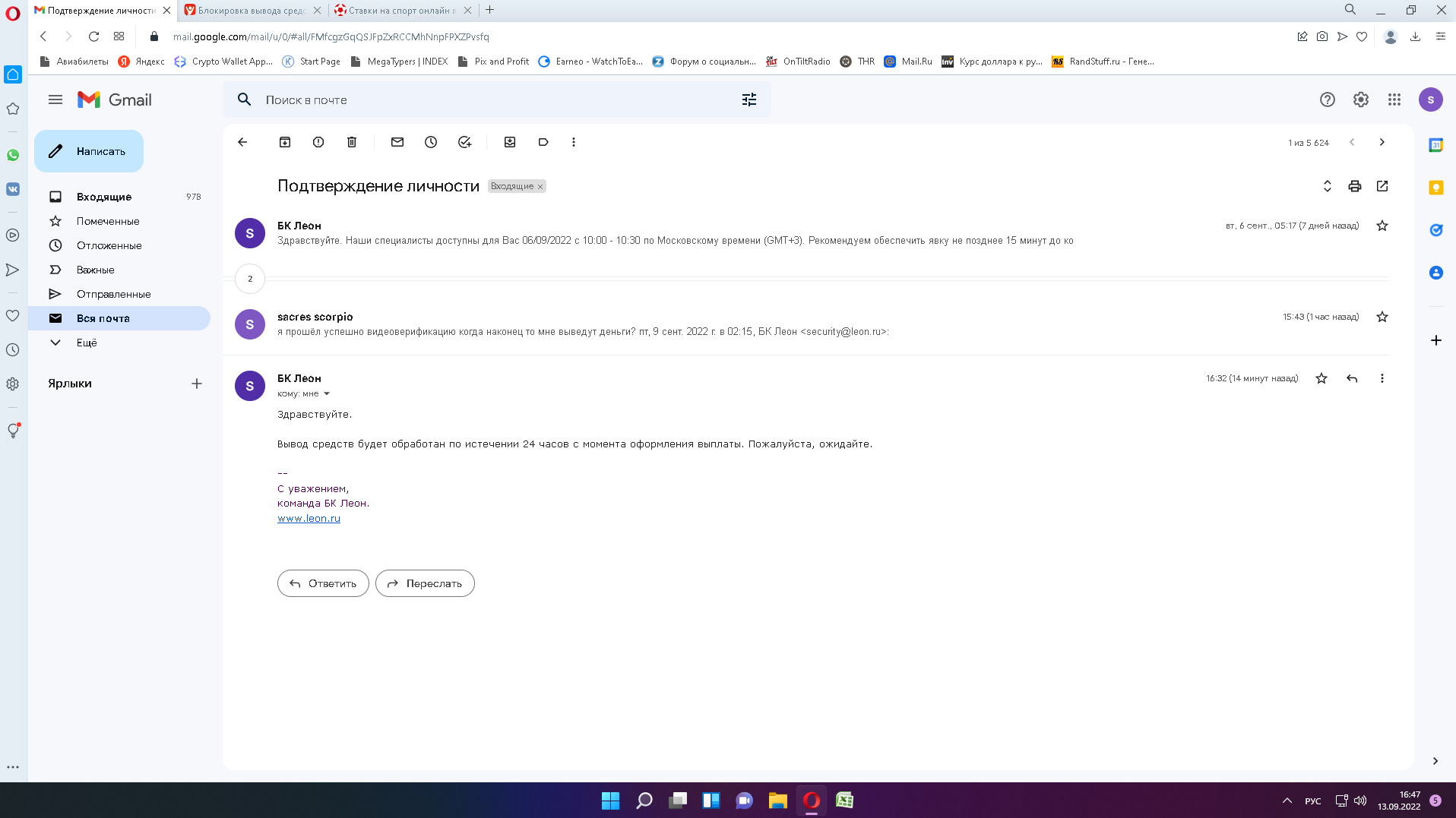 6.09.2022 была верификация сегодня 12.09.2022 прошло уже более 5 дней с момента видеоверификации нет сообщений на электронной почте деньги до сих пор не выводятся