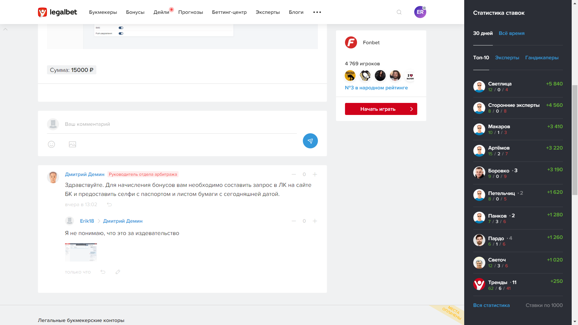 Всех приветствую, хочу поведать вам свою историю, три дня назад в 12:30 я оставил свою жалобу здесь, и после получил ответ от администрации легалбет с инструкцией, дабы получить свой заветный фрибет, я получил ответ 29 августа в 13:02 там было сказано, что мне нужно скинуть фотку паспорта с листком бумаги и датой на форуме, я увидел ответ утром 30 августа, буквально в течении нескольких часов счастливый все выполнил, но по итогу получил много грубых ответов от Администрации Фонбет, я расстроен максимально, поскольку на мгновение поверил в чудо, я был счастлив, я был готов плясать, но по итогу как обычно получил разочарование, Администрация Легалбет, помогите мне пожалуйста, доведите данное дело до конца пожалуйста