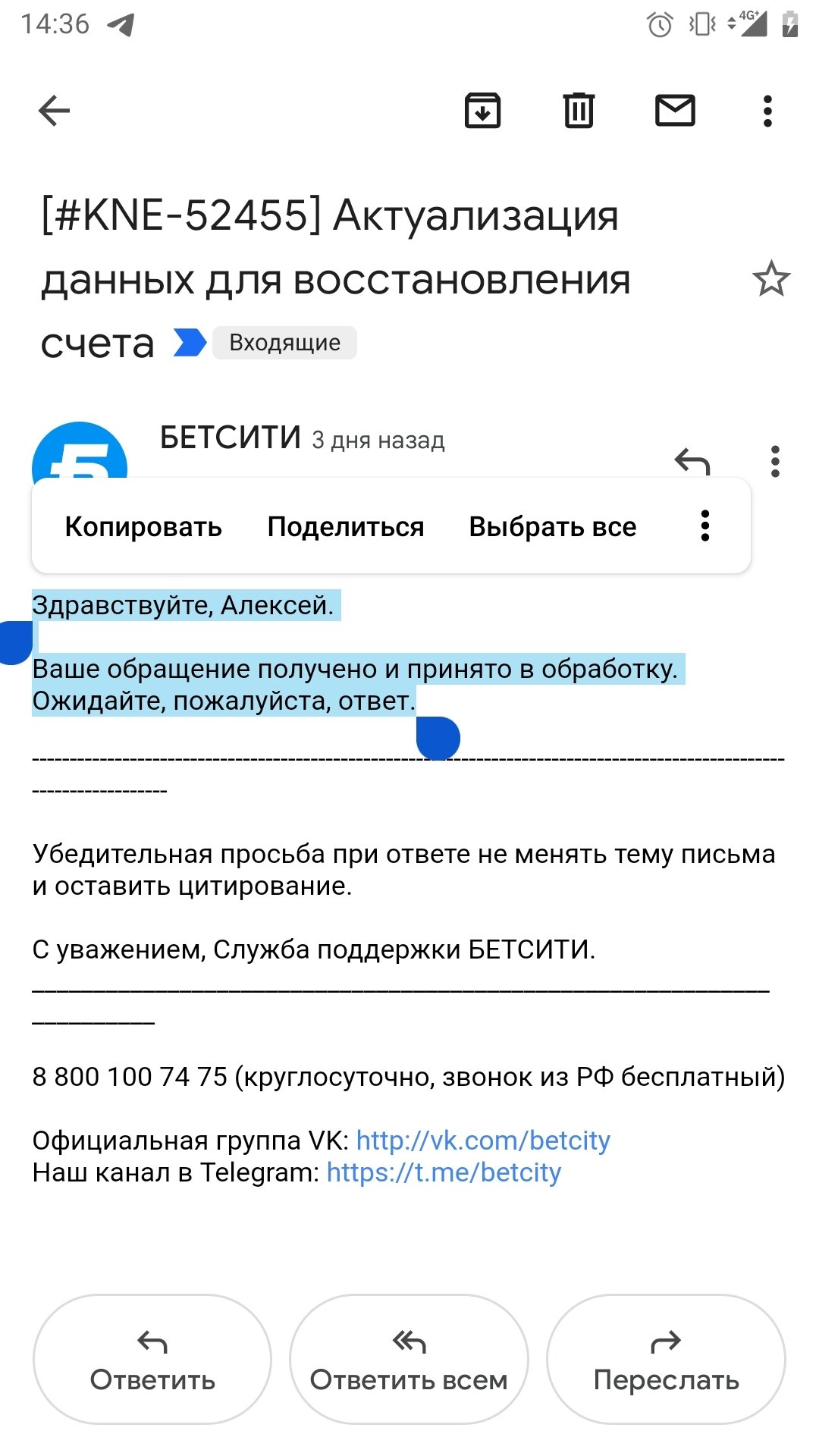 Был приличный оборот средств и находился примерно в 0 в игре на конторе betcity. Позволяла выводить и вводить деньги, но как только произошел выйгрыш в 120 тысяч, то в выводе было отказано "по техническим причинам". А после просто выбило из аккаунта и пароль стал неверным. При попытке восстановить пароль пишет, что обратитесь в службу тех поддержки. А они, естественно, молчат