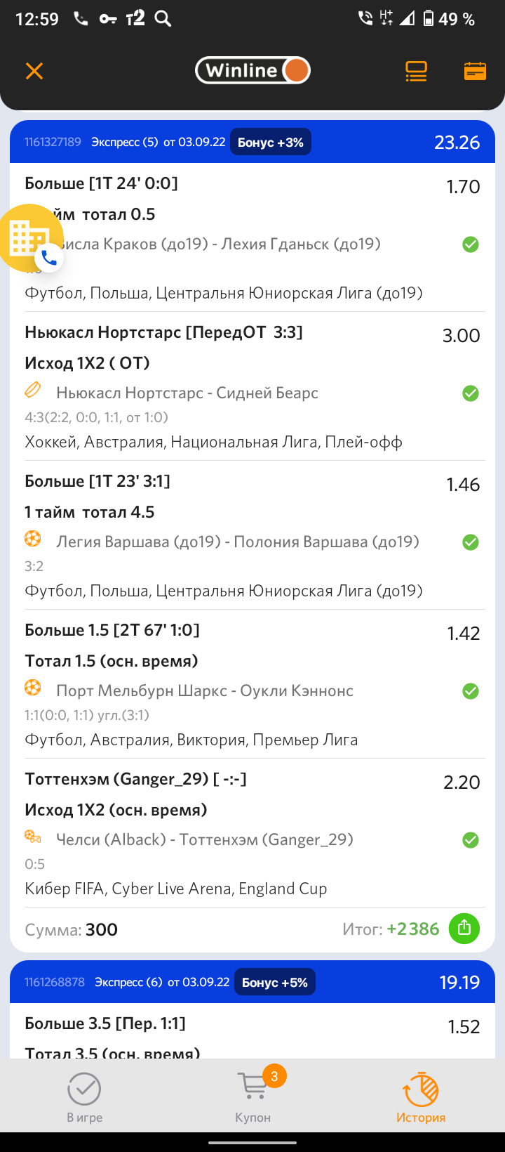 Ставил экспресс в винлайне сначало рассчитали правильно, но через минут 10 с моего счета списали деньги на вопрос почему ответ меня поразил одну из ставок с кф 3 они мне пересчитали как 1