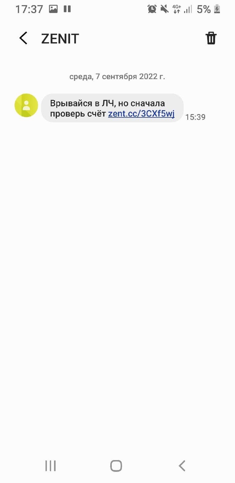 Здраствуйте. Пришло сообщение от бк Zenit. Что пора играть проверьте счет. Был начислен фрибет 300р после выйгрыше вывел средства заранее ответив на ключевые вопросы которые были при регистрации. После ожидангия деньги не поступали. Решил зайти с пк на сайт зенит и что я вижу что балланс 0 все в нулях выводов не делалось. Насколько я понял что я ставил с какой то не понятной конторы зенит и почему то я на ней зарегестрирован введены все вопросы все номера авторизован. И почему то с нее мне приходят смс под видом легальной конторы зенит. Что это вообще такое???? номера счетов в зенитах 2215543 и 3267171