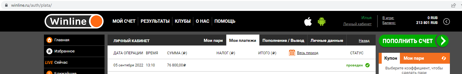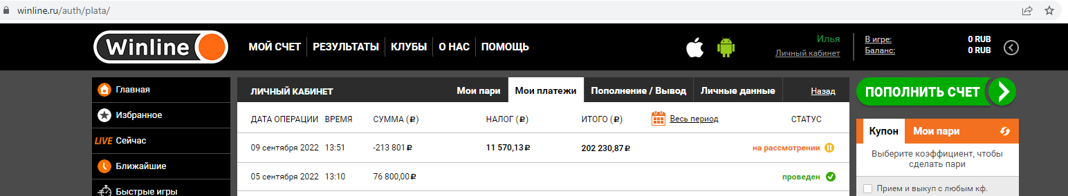 После нескольких выигрышей и попытке вывести небольшую часть, winline заблокировал вывод средств (не могу вывести любую сумму с ) Почти сразу пришёл запрос на повторную верификацию. Её я успешно прошёл, по видеосвязи нужно было показать два документа, паспорт и загран. паспорт. Затем в техподдержке меня попросили отправить на адрес договор на дебетовую карту, на которую вывожу деньги. На что я сообщил, что это виртуальная карта, выпущенная в тинькофф, и договора на такие карты не предоставляют. Тогда попросили прислать скриншот из личного кабинета, где будет видна эта карта. Что я и сделал. Через два часа служба безопасности ответила, что им нужно фото бумажного договора (или другого документа где будет номер карты и мои фио, не скриншот). Запросил такой документ в техподдержке банка (справка о договоре, что на моё имя выпущена дополнительная виртуальная карта) От представителя тинькофф банка получил данную справку и отправил фото на Тем временем в личном кабинете БК для вывода остался только вывод через банковский перевод. Отправил запрос - прошло уже больше 18 часов, подтверждения нет, статус перевода: "на рассмотрении" Примерно столько же прошло с момента отправки фото документа в службу безопасности - полный игнор. Что ещё нужно сделать, чтобы мне отдали мои деньги?