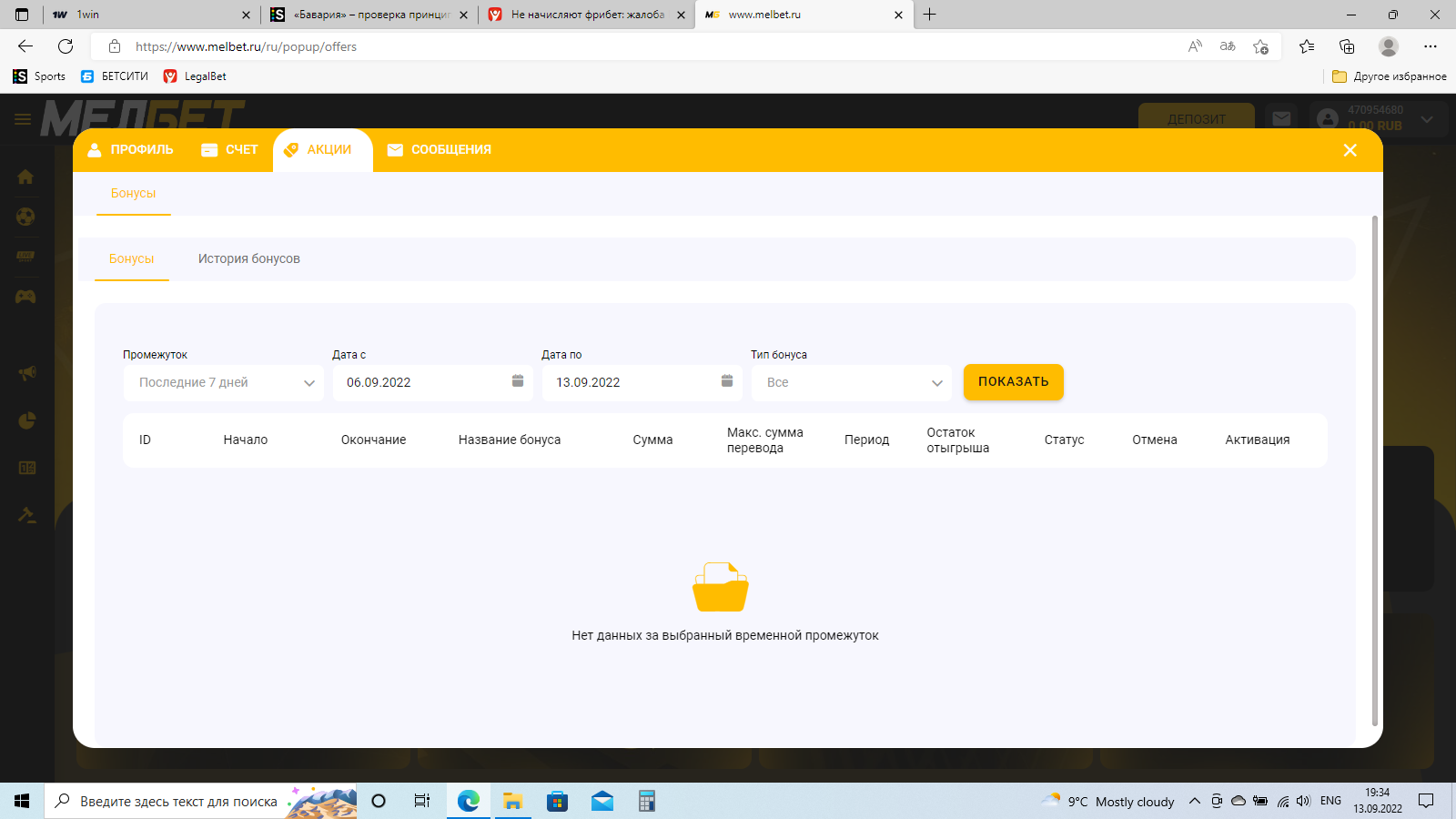 Здравствуйте. Нам сообщают, что фрибет был вам начислен 9.09, вы его не использовали и он сгорел 12.09. Можете выложить скрин из ЛК с историей бонусов?