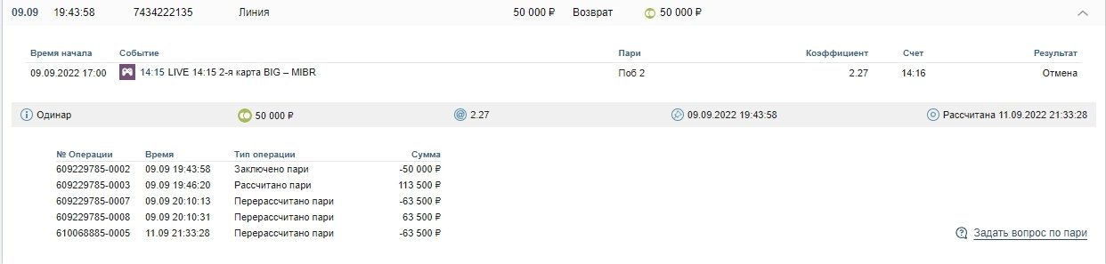 Приветствую, пишу чтоб обратить на себя внимание. сделал ставку 50000 рублей на кф , она выиграла, я забрал выигрыш. На следующий день пополнил баланс на ту же сумму и повторил успех. Ставка выиграла. Выводить не стал деньги, потому что уже был в плюсе более чем на 100 тысяч рублей, оставил деньги на балансе и на следующий день зашел играть снова. Сделал 2 небольшие ставки, проиграл их, решил отложить игру до следующего дня и вывести средства. Создал заявку, но фонбет списал с меня баланс, в истории операций появилось сообщение ( 21:33:28 610068885-0005 Перерассчитано пари -63 500 ₽) Баланс был 85500р, осталось 22 тысячи. То есть спустя 2 с лишним дня мне просто отменили мой выигрыш за первое пари. Такого опыта еще не было, делаю ставки давно, в минусе за год где то на 700 тысяч, удивлен что бк могут вот так нагло воровать деньги со счета, тем более цуписная. Номер моего счета:15414879 Прошу помогите!