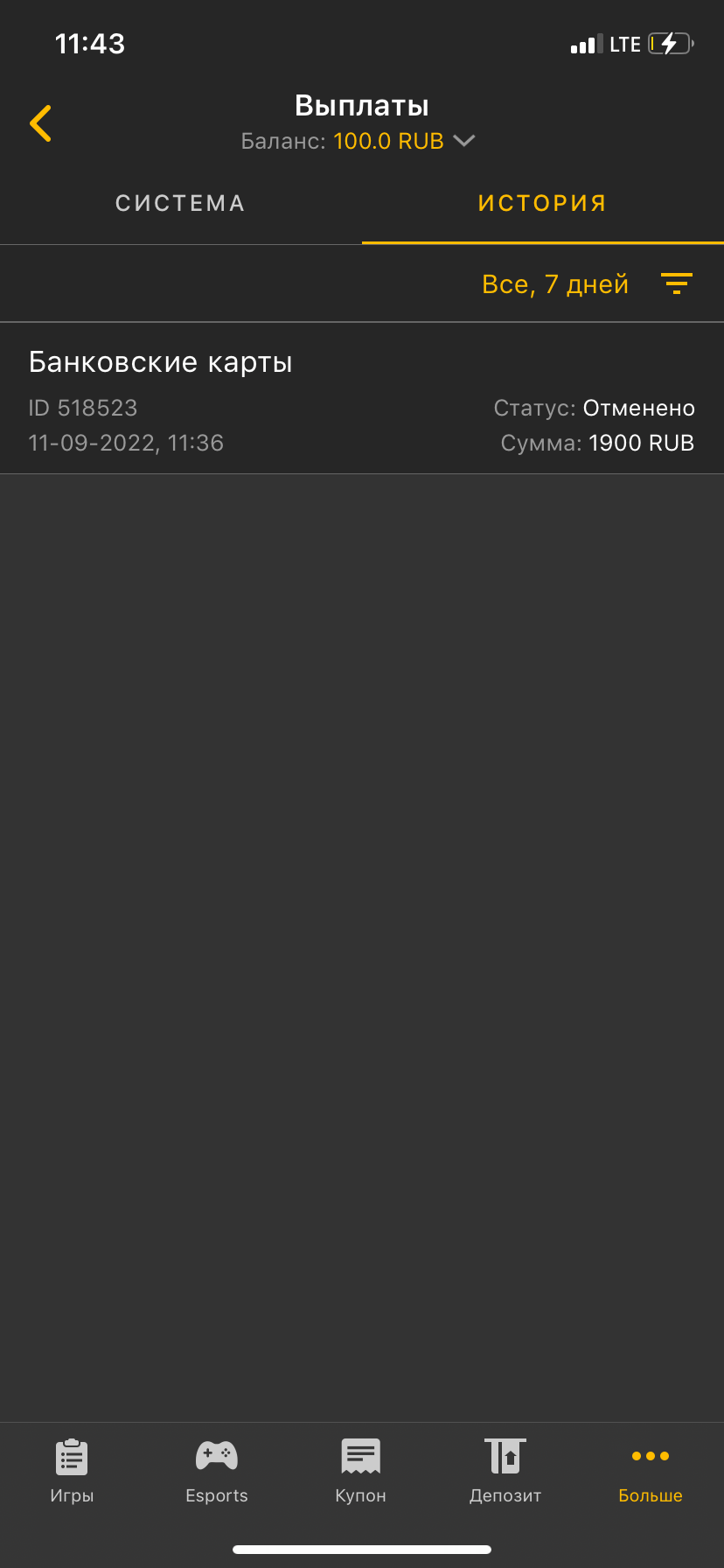 Поставила в субботу на вывод, до этого приходил моментально, а тут уже двое суток жду. Но, это ещё пол беды, первый раз вижу, как в бк можно уйти в МИНУС 😄 Легалбет, будь добр, реши проблемы