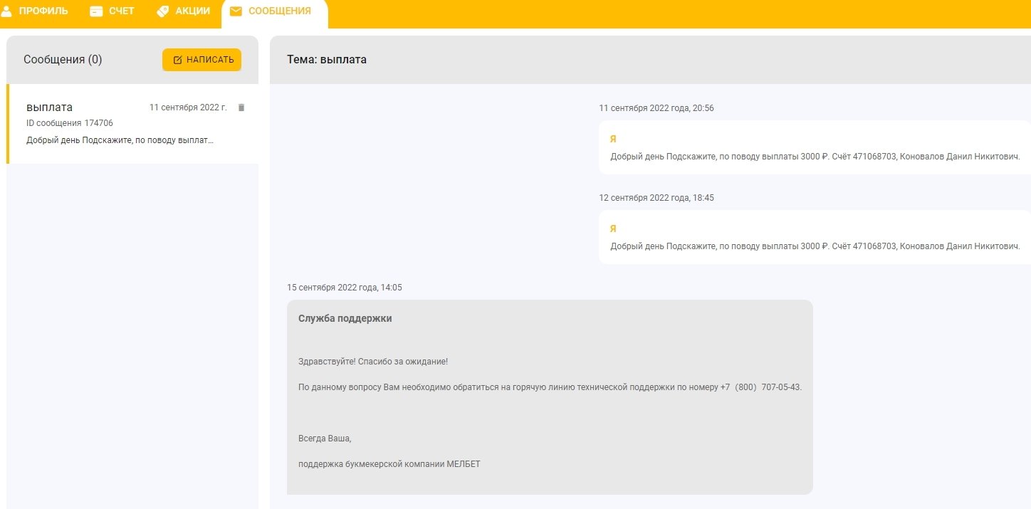 Через 12 дней пришло сообщение от мелбет, что заявка на вывод отменена. Зашёл на сайт, на счету оставили 100 рублей. 3000 руб. нигде нет. Позвонил в поддержку в ТРЕТИЙ раз, после долгого отсутствия оператора, мне сообщили, что я не выполнил условия подарочного фрибета. Я должен был ДОГАДАТЬСЯ пройти проверку и сбросить им скрины паспорта. На мой вопрос, где я могу про это прочитать, мне дан ответ, что акция закончилась и прочитать уже об этом невозможно. Хотя я в тот же день обращался в поддержку, но мне никто ничего об акции не сказал, не написал. На лицо факт мошенничества. Уважаемый легалбет помогите наказать этих му...чудаков. Или подскажите, куда стоит обратиться дальше.
