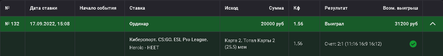 Добрый день! Почему-то мне сделали перерасчёт ставки. Я ставил на матч Heroic vs HEET на 2 карту на тотал матча 25.5 меньше. Букмекер рассчитал её правильно, но! понизил коэффициент в следствие чего мои доход стал на 6000 меньше! Попрошу сделать правильный рассчёт, ибо это не какой-то топ100 команды играли, а именно тир1 команды. Плюс это ESL турнир, это LAN, где нет подставных матчей, нет договоренностей и вследствие чего мне сделали перерасчёт я не понимаю... Попрошу выплатить мне мои средства, а после вывода на карту, я бы хотел удалить аккаунт. Не хочу ставить там, где сплошные мошенники...