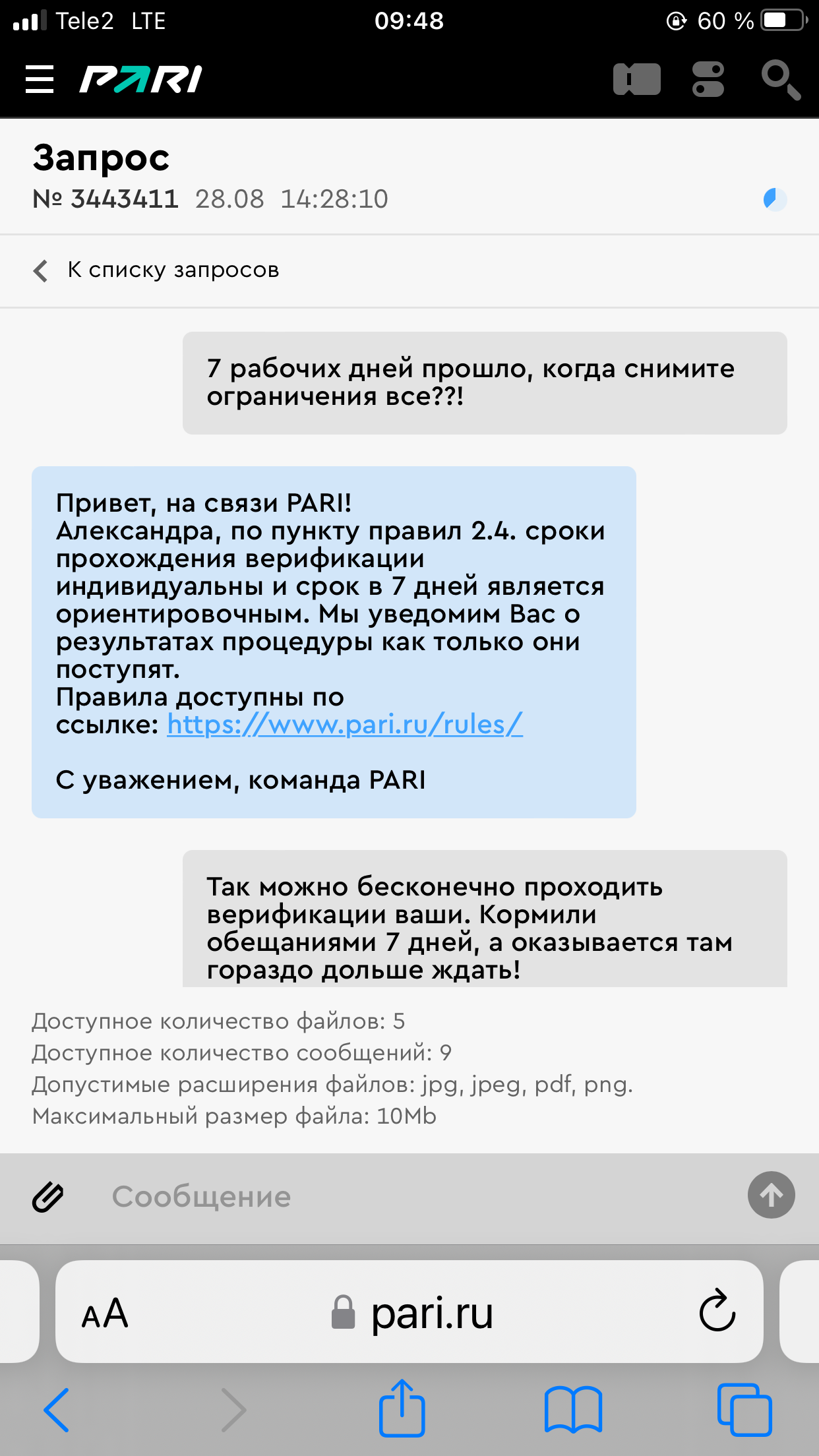 Была зарегистрирована ещё на старой версии париматч.ру, вроде с января, потом восстанавливала пароль уже на новой платформе пари.ру. Играла только на топовый футбол, в итоге как баланс вышел к сумме 300к+ после ставки заметила что понизили лимиты, и заблокировали вывод,28августа, и начался ад, пришлите фото паспорта, фото меня с паспортом, фото меня с паспортом и монитором, пришлите фото в течении 20минут! Я все это сделала моментально, от них постоянная задержка в виде троих дней якобы проверка фото, далее запросили видеоконференцию, в назначенный день я ее прошла, в итоге опять говорят ждать 7 дней! На видео задавали вопросы не касающиеся моих ставок и я не знала как ответить, именно я не знаю что такое офсайд , удар в створ ворот, к слову я на это и не ставила никогда, Мне не зачем это знать, и сам футбол я не смотрю, объяснила им это все. К тому же с начала проблем с верификацией у меня трагически погиб отец. Что я испытываю эмоциональное потрясение. Я их оповестила О этом. Но сроки 30дней для прохождения видео я не нарушала! И вместо того что бы просто позвонить в скайпе проверить паспорт, и что я это я они задавали кучу вопросов, на события которые я никогда не ставила. Помогите пожалуйста вернуть деньги.