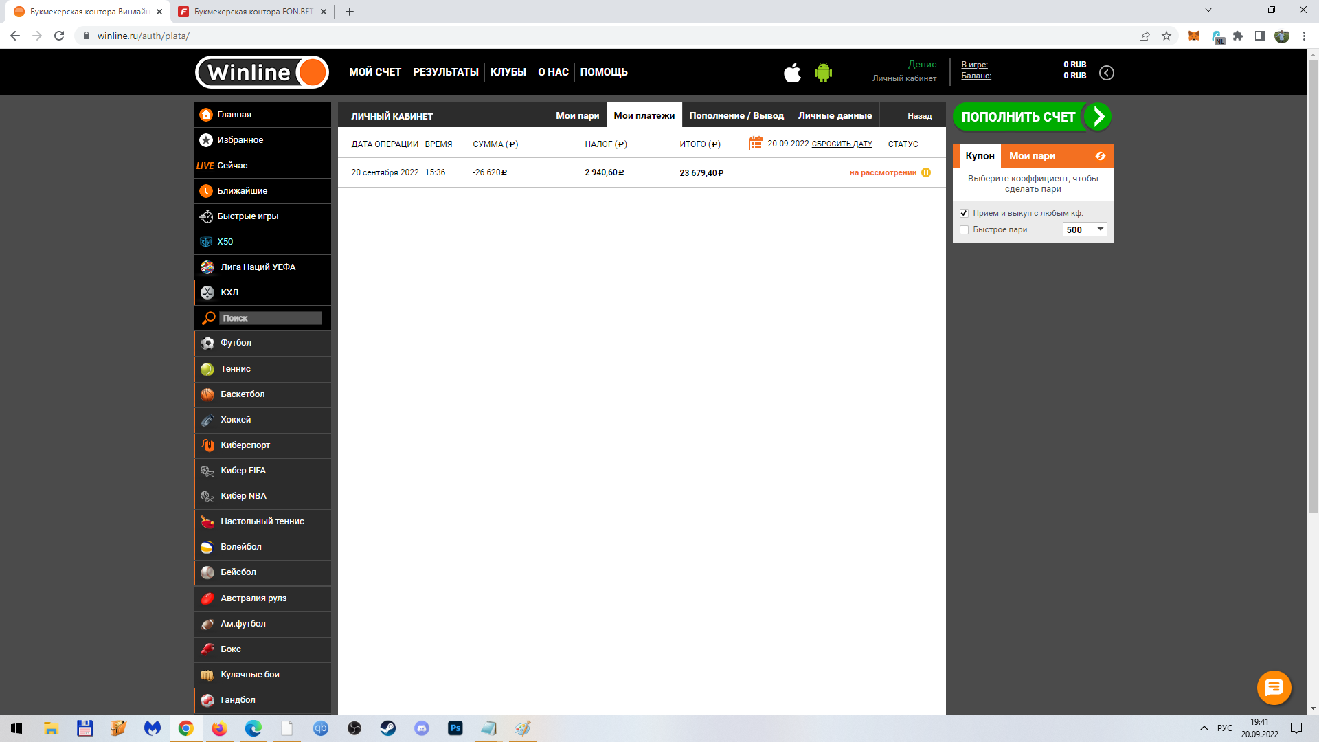 Зарегистрировался летом, играл как все - выигрывал и проигрывал. Выйдя в небольшой плюс решил вывести денежные средства, нажал вывод, ввел всю сумму 26620(, из которых 2940,60 должны были списаться в качестве налога, т.к. при выплате более 15000 налог платит БК а мне должно было поступить 23679,40, , тут все честно,). Подтвердил вывод, обновился статус "на рассмотрении". Жду, проходит день, просят фото карты (лицевая сторона, с прикрытыми 5-6 цифрами) - скинул. Затем приходило смс с просьбой отправить реквизиты перевода Сбербанк на почту - отправил, затем вывод висит еще день и отменяется. потом пробовал вывести, ошибка( как пишет ЦУПИС отмена со стороны букмекера). Вчера попытался поставить вывод не на карту, с которой было пополнение а на кошелек ЦУПИСа - тоже самое, пришло смс .."при выводе бла бла что-то пошло не так". Почему обращаюсь именно к Вам? -букмекеру и звонил на горячую линию, и писал в чат техподдержки, и никто в чате не отвечает, до техподдержки так и не дозвонился(хотя пробовал звонить в разное время суток).