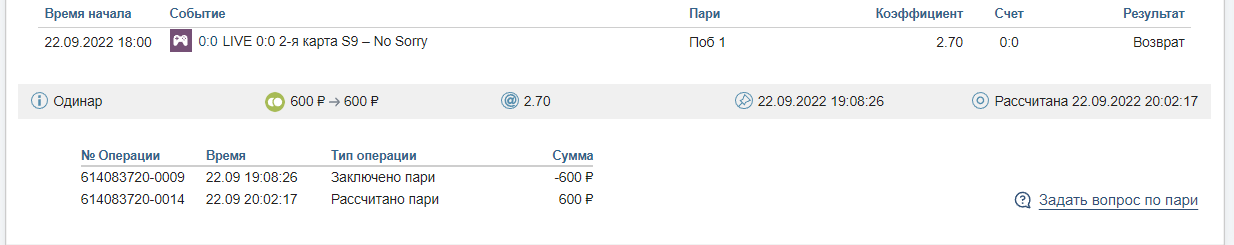 Ставка 614083720-0014 Ставил на вторую карту, произошло техническое поражение и по официальным источникам результат игры 2-0. Букмекер сделал возврат, хотя должен был рассчитать как выигрыш, прошу разобраться и наказать мошенников из фонбета