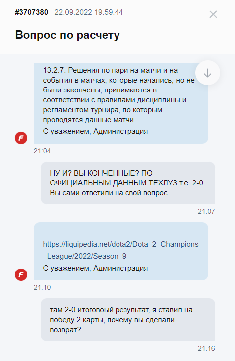 По информации от букмекера, ставка рассчитана возвратом согласно п.п. 13.2.12. Действия БК в рамках правил.