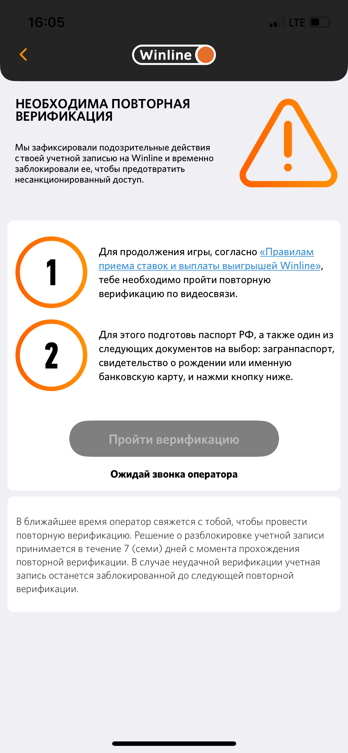 Добрый день ! В винлайн играю достаточно давно , плюс они стали спонсором моего любимого клуба с детства , и у них интересное предложение с любимым клубом . Пару недель назад , пришёл запрос на повторную идентификацию . Нажал кнопку в приложении , мне позвонили в вотс ап , я предоставил документы и сказали ожидать в течении 7 рабочих дней ( это было 16ого сентября ). Прошло время , ни ответа ни привета , на сайт захожу все так же говорит кнопка о повторной верификации ( нажимная ее уже никто не перезванивает ) . По прошествию 7 рабочих дней пишу письмо в саппорт . Текст Письма: Добрый день ! 16ого сентября я прошёл повторную верификацию с представителем Винлайн по вотс ап. Обещали обработку в течении 7 рабочих дней ) они прошли ). И ни ответа, ни привета . Понимаю, что на счету всего 4000р, но я как болельщик Спартака играю в вашей бк , коплю баллы, посещаю мероприятия ( ресторан на стадионе с показом матчей , прогулка на теплоходе в 100ие клуба). Я максимально открыт и Вы постоянно меня видите на матчах, на стадионе . Объясните пожалуйста почему такое отношение и что делать с верификацией . Ответ просьба направить на данную электронную почту , с которой вам пишу.Спасибо и хорошего дня» И снова 3 дня молчания ? Никто не выходит на связь На счету небольшая сумма 4000р, но я бы хотел продолжать поддерживать клуб и ставить на его матчи в бк-партнере ФК Спартак Ниже скрин с приложении и скрин о том что был звонок с представителем бк