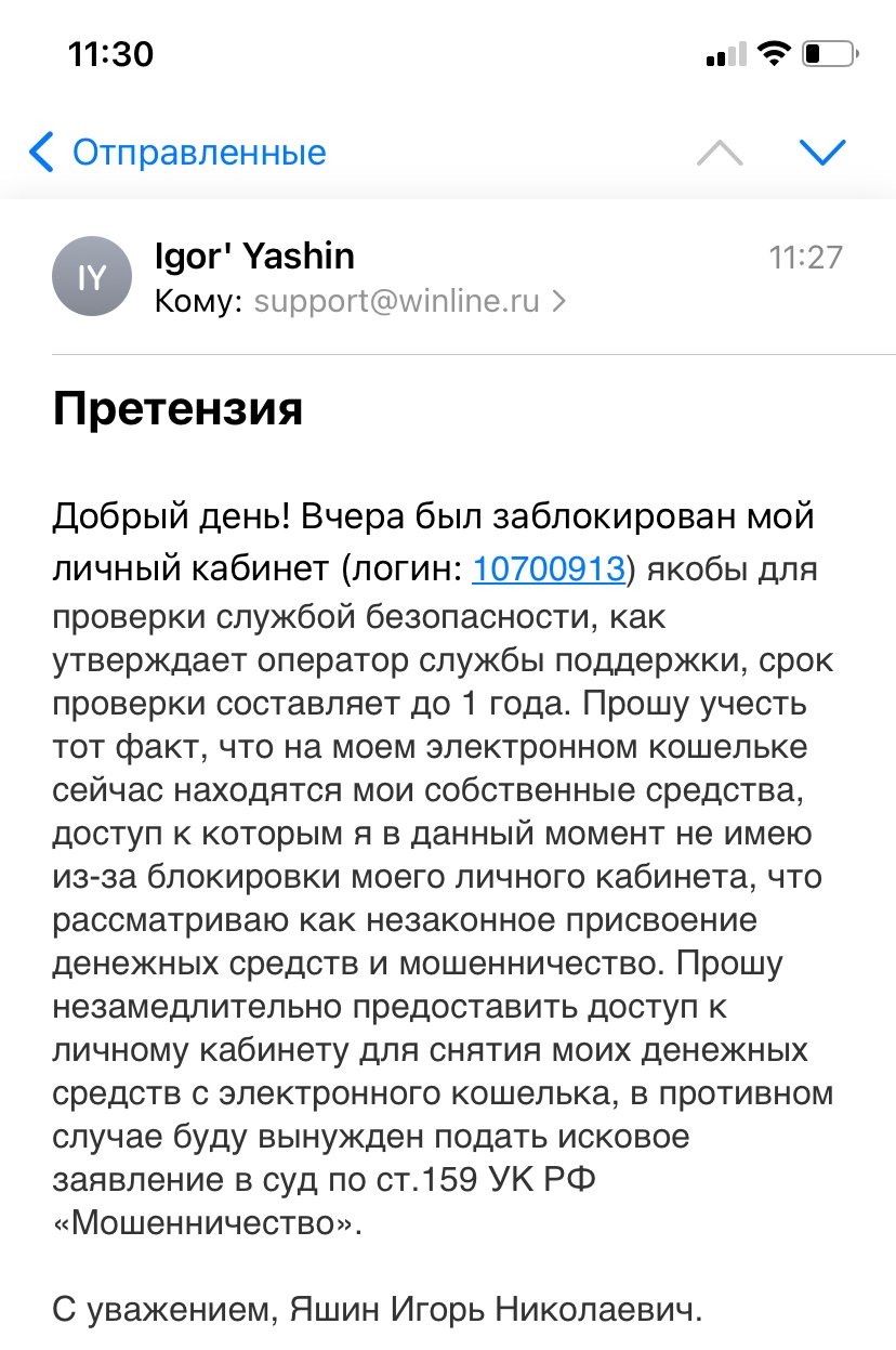 Логин: 10700913 (ВинЛайн)Довольно давно являюсь клиентом ВинЛайна, все возможные верификации давно пройдены. Регулярно ставил на самые различные события, проблем с выводом выигрыша не возникало.Вчера сделал ставку - экспресс на 4 события, экспресс выиграл, ставка рассчиталась и средства зачислились на баланс. Прошёл час - и баланс был уменьшен на сумму выигрыша и самой ставки!!! Состояние ставки было снова «В игре»!!! Т.е. рассчитанную выигранную ставку вместе с выигрышем и размером самой ставки просто взяли и изъяли. Ещё через час мой личный кабинет был заблокирован, якобы из-за нечестной игры!!! Обратился в службу поддержки и не получил объяснений по блокировке, предоставить доказательства в чем именно была «нечестность» также отказались!!! Кроме того, помимо той выигрышной ставки, которую по непонятной мне причине забрали, на электронном кошельке имеется часть моих средств, доступ к которым я в данный момент не могу получить из-за блокировки личного кабинета, что расцениваю как незаконное присвоение денежных средств и мошенничество! Прошу предоставить помощь в решении данного вопроса - вернуть ЧЕСТНЫЙ выигрыш и предоставить доступ в личный кабинет для вывода денежных средств. Если ситуация не изменится буду подавать исковое заявление на букмекера в связи с нарушением букмекером федерального закона.