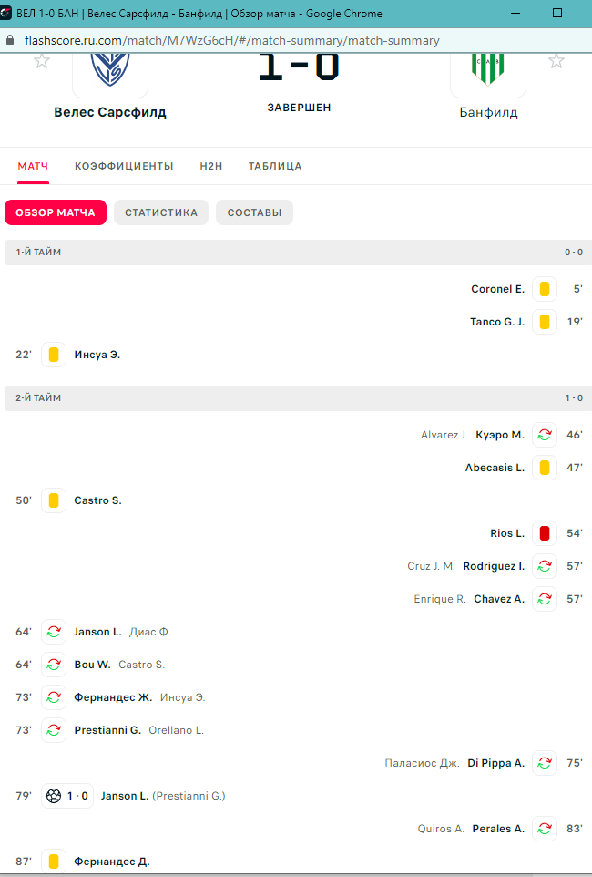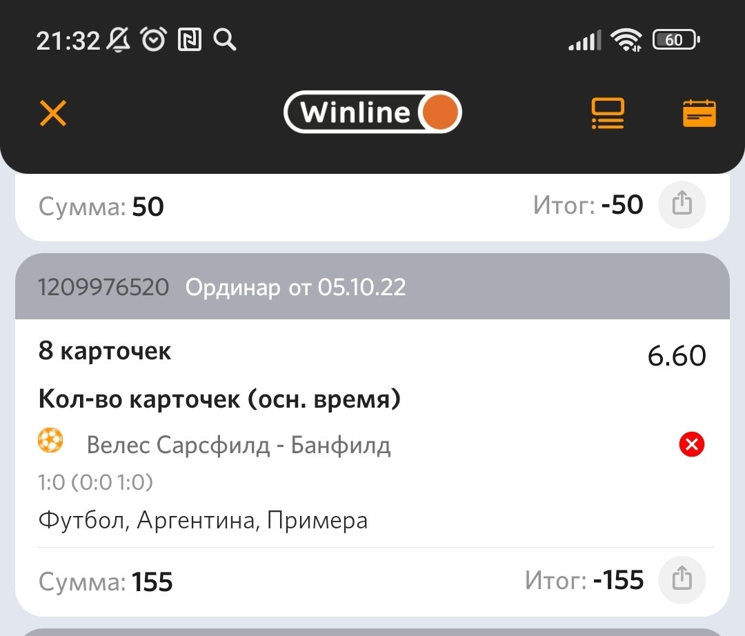Добрый вечер! Кажется, что у Winline снова есть проблемы с подсчётом карточек в матче. Пример №1 матч Интер - Барселона, где официальный сайт УЕФА, как и многие другие источники утверждает, что карточек было 9, из них 2 главным тренерам и 7 полевым игрокам, скрин прилагаю. Пример №2 матч Велес Сарсфилд - Банфилд, где по итогам матча было 7 карточек, одна из которых красная, официального сайта не нашёл, но на всех источниках информация одинакова, в матче 8 карточек, прошу подключиться к решению вопроса