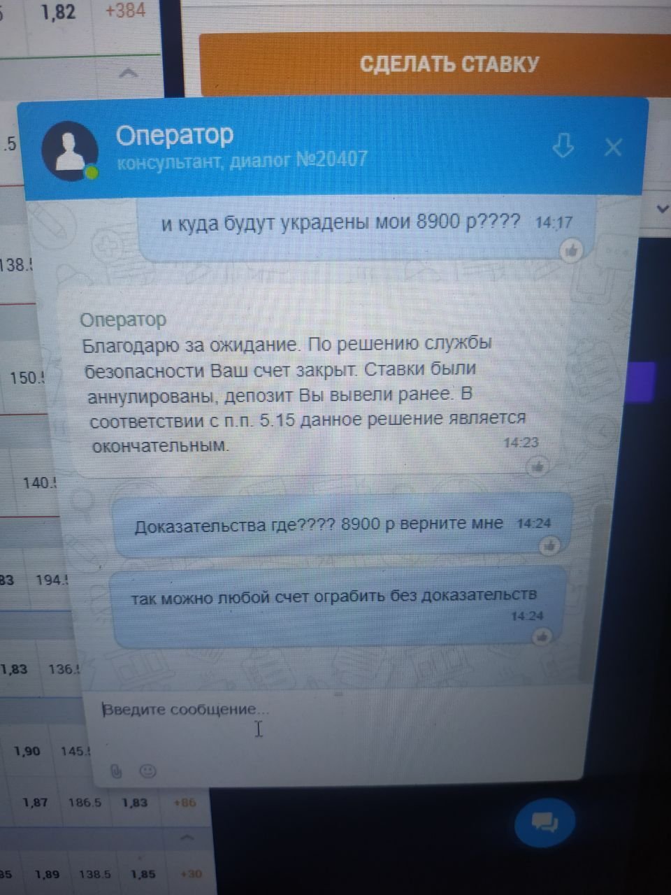 Уважаемый Арбитраж! БК без всяких оснований заблокировали мой счет на 60 дней. Эта подлость произошла после 2 успешных верификаций: 1) фото паспорта и обеих сторон банковской карточки, после чего был открыт вывод денег(следовательно верификация была успешна) 2) селфи с ноутбуком на котором открыт личный кабинет в бк зенит и основной разворот паспорта, после чего опять откыли вывод денег. После этих верификаций у них не осталось никаких законных оснований "отжать" у меня деньги и они решили просто "заморозить" мой счет, чтобы не отдавать деньги! Проошу разобраться.