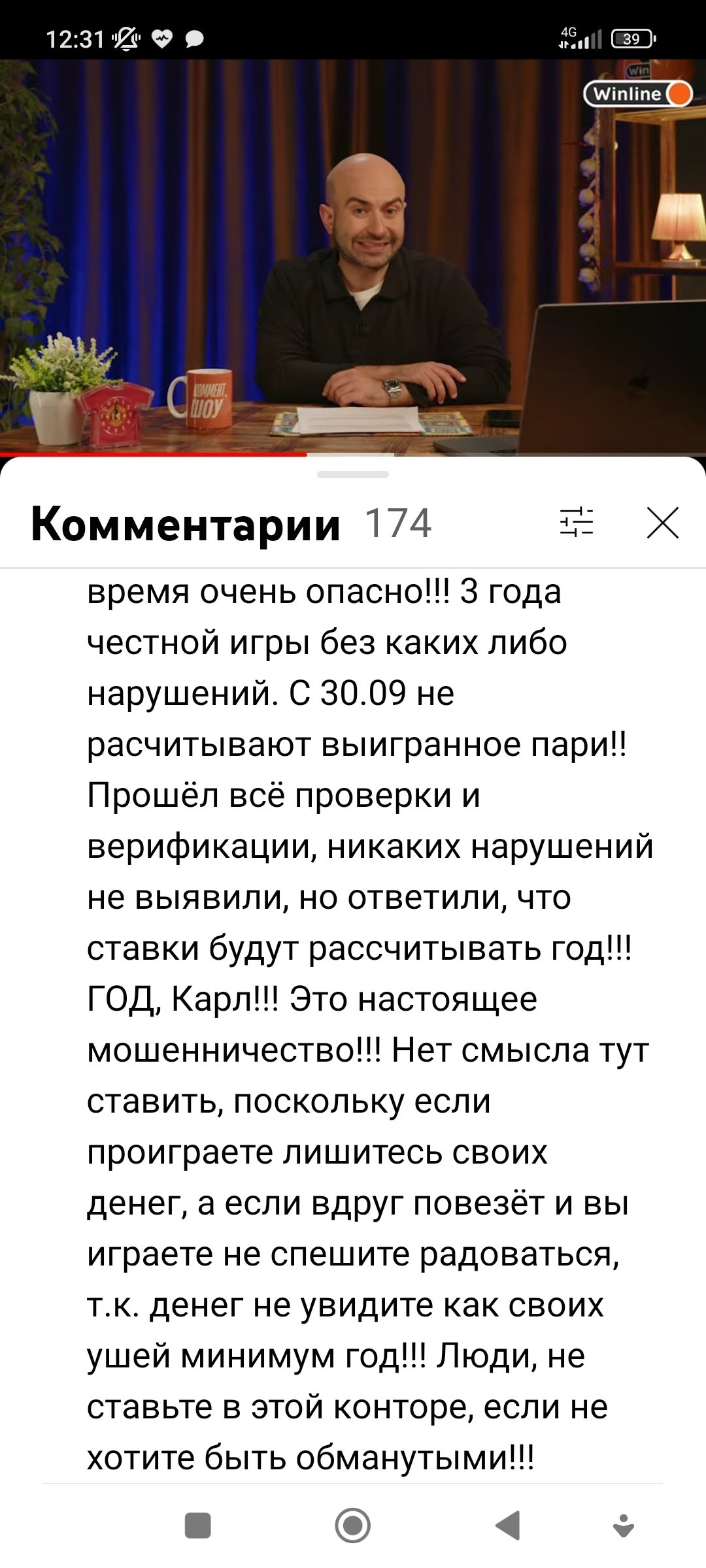 А потом чистую прибыль 10 лярдов в год показывают. Конечно, за@сь устроились проиграл человек за пару минут рассчитали. Выиграл - можно его деньги год крутить, а потом ещё под надуманным высосанным из пальца предлогом выигрыш не платить! Зачем вообще ставить вообще, если всё равно выигрыши не платят, БЕЗ ВАРИАНТОВ!!! Это лохотрон хуже МММ!!! А если вскроется факт, что хоть 1 человеку поставившему на не рассчитанный мне матч на другую команду засчитали поражение и деньги за минуту матча забрали. (а я уверен что таких много и есть тому косвенные доказательства - это чистой воды уголовщина!!! Не хотят по хорошему надо писать коллектианое заявление в Следственный комитет, пусть вывернут эту шарагу мехом внутрь. Мавроди посадили и до этих доберутся!!!!