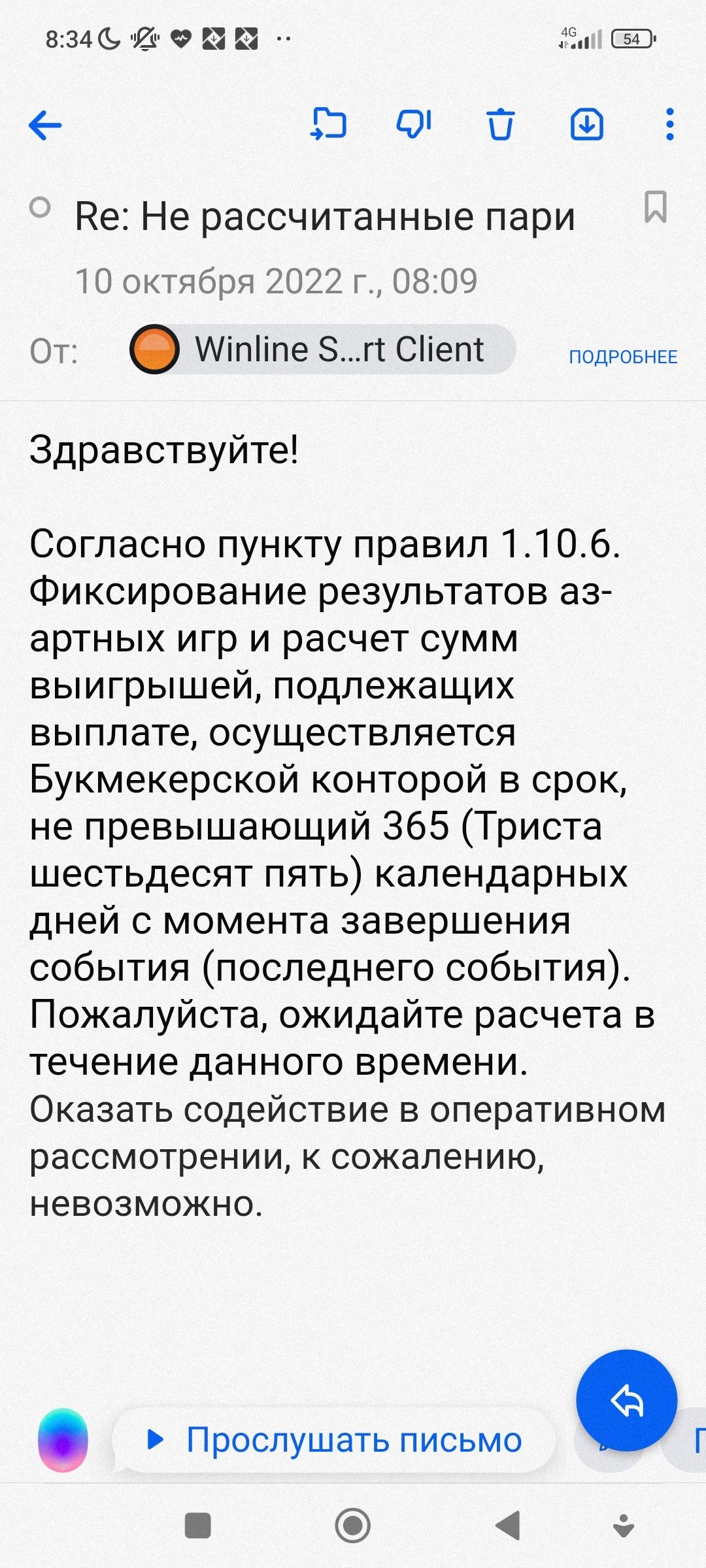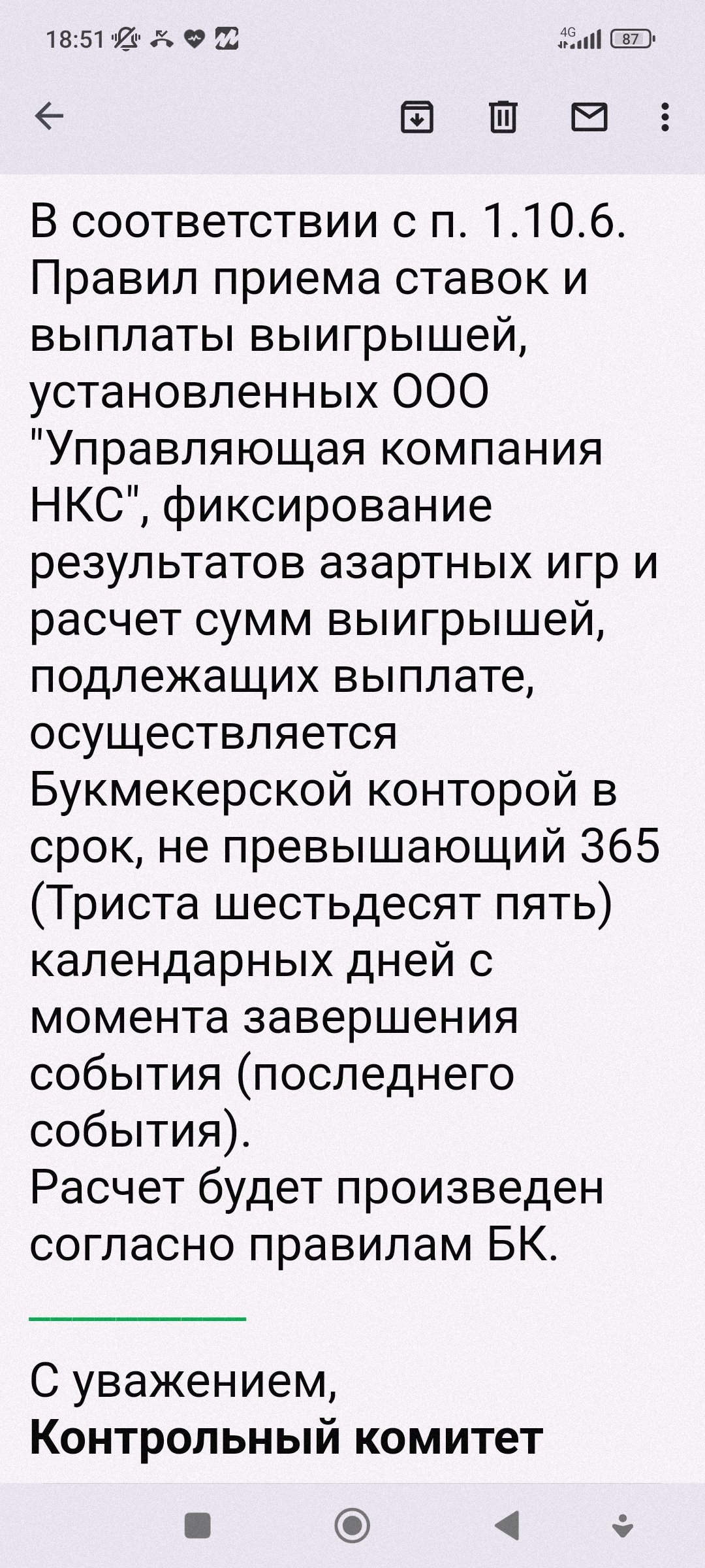 По информации от букмекера, ставка будет рассчитана в течение 365 дней согласно п.п. 1.10.6. Длительная задержка расчета ставки букмекером не аргументирована.