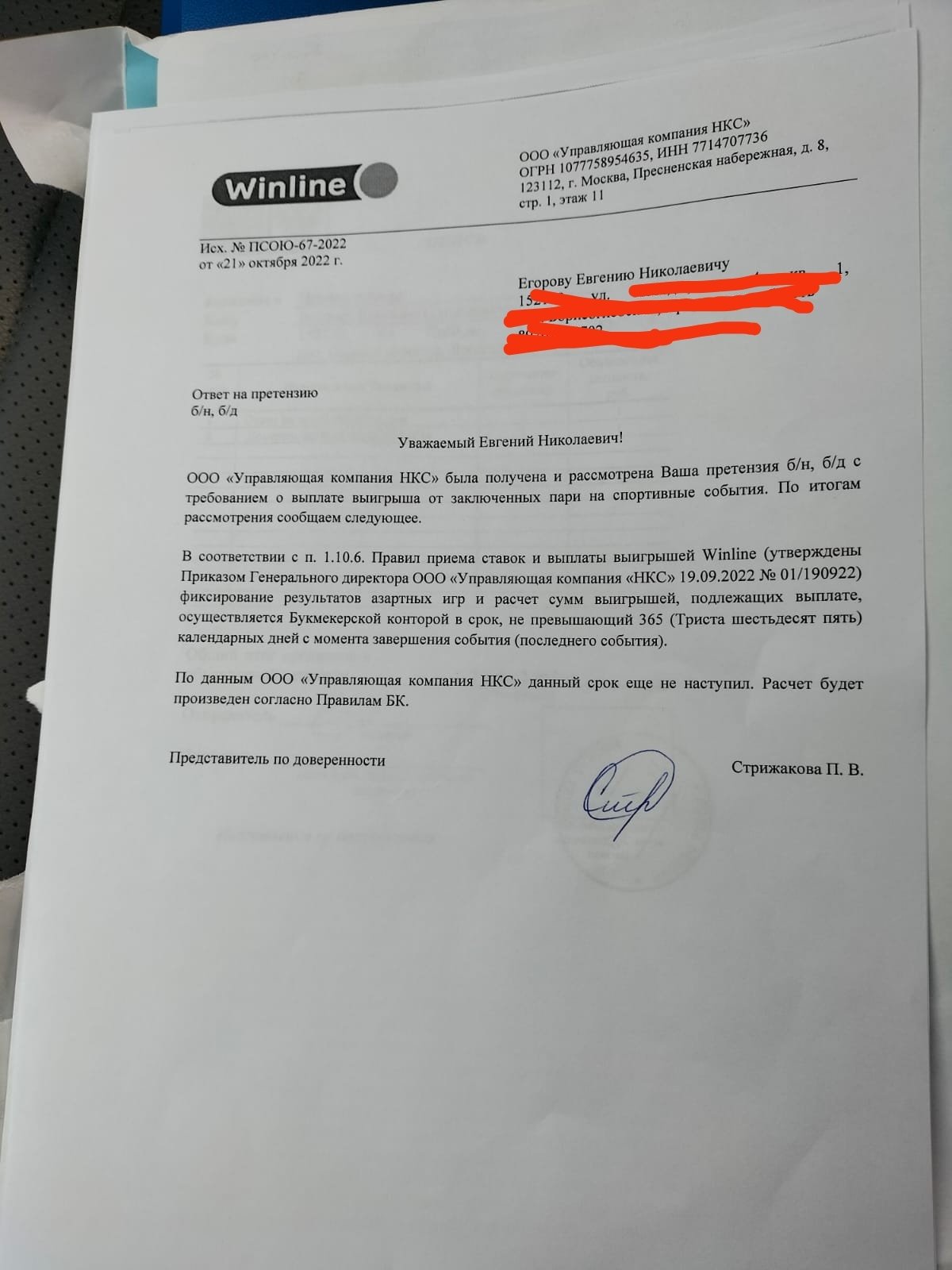 заключил 2 пари в БК Winline. В дисциплине Dota 2. На победу к1 в матче и победу к1 в первой карте. (Скриншот прилагаю) Матч состоялся, результат определен в тот же день и обе мои ставки выиграли. (скриншот прилагаю) Играл всегда честно, никаких правил БК не нарушал. Разместил пари по своей инициативе согласно предложенной букмекером линии и лимитов ставок. Матч признан состоявшимся и завершился победой к1 со счётом 2-0. Результат матча официально включён в протокол соревнований, его результаты не достоверными не признавались. До сих пор () мои ставки букмекером не рассчитаны. Прошу оказать содействие в, скорейшем справедливом расчёте моих пари, т.к. я их честно выиграл и получении мной заслуженного выигрыша