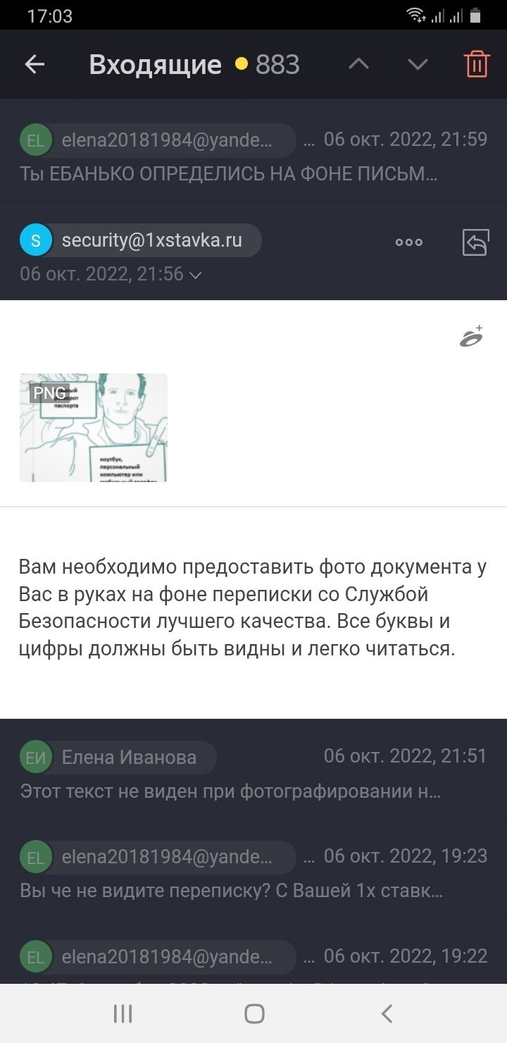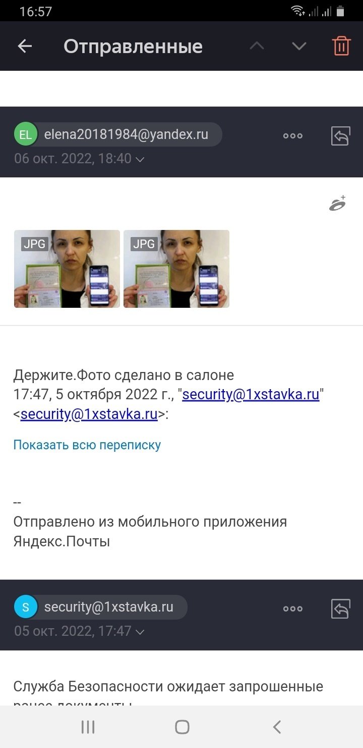 3 недели пытаюсь пройти вериф .т.к.не выводят мой выигрыш 30000р.И оказывается пройти верификацию НЕВОЗМОЖНО НА 1Х СТАВКЕ.Через каждые 3 дня запрашивают новые фото.Запросили селфи на фоне переписки с их конторой и с паспортом.Направила.Прислали селфи нужно сделать не на фоне переписки-а на фоне конкретного письма от них.Что за бред? Помогите вывести деньги.Селфи я делала в салоне фотографии-качество отменное, все читается.Но их это не устраивает.Они НЕ ВИДЯТ