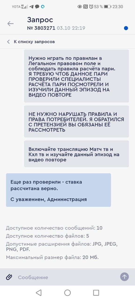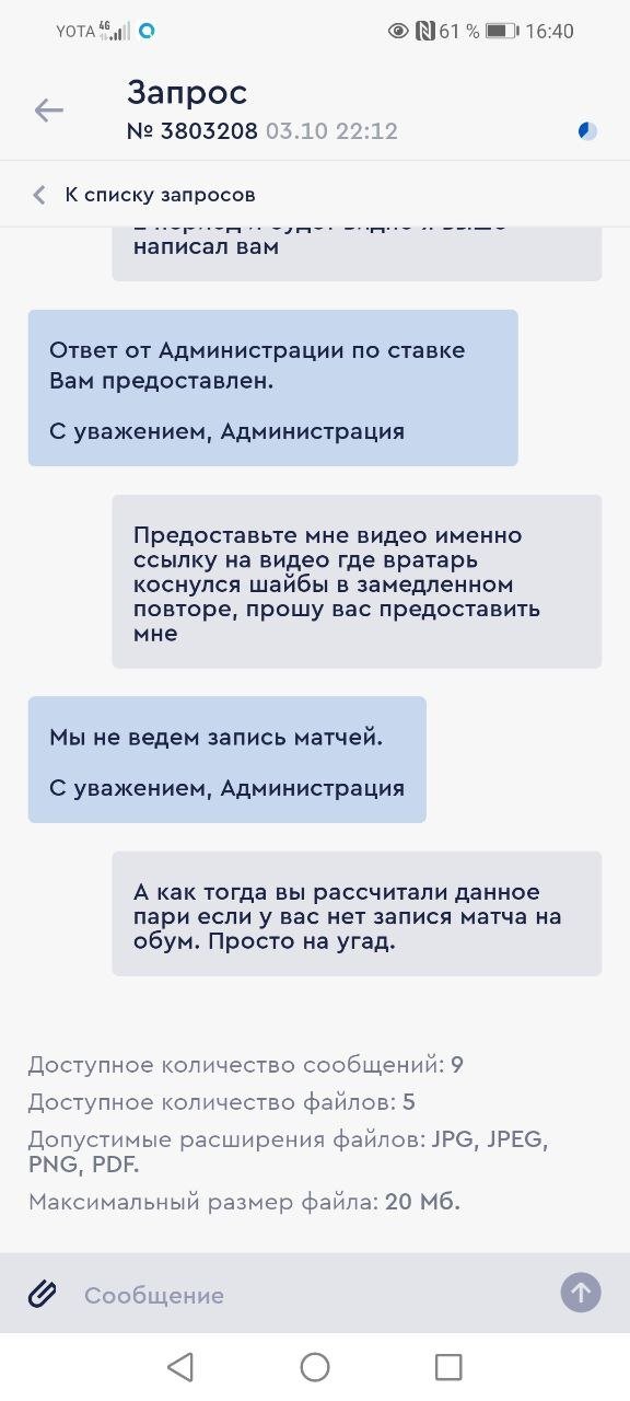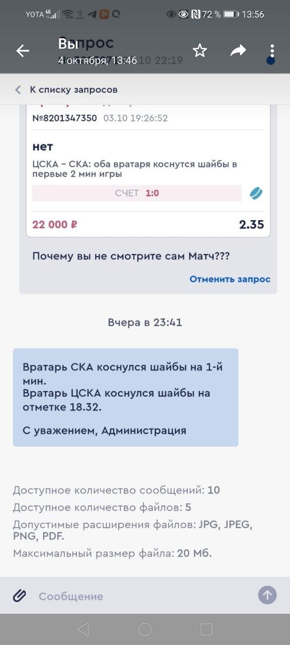 Неверно расчитано пари номер 8201347350 ставка оба вратаря коснуться шайбы в первые 2 минуты игры нет!Вратарь ска коснулся шайбы на 1 минуте игры ,а на 18-32 на секундомере как утверждает фонбет касания шайбы вратарем не было!!!Если посмотреть видеоповтор в замедленном режиме не видно там касания шайбы вратарем. Даже если судить по движению шайбы, она падает вертикально вниз прямо под ноги защитнику. От ловушки вперед так шайба отскочить не могла. И ловушка вратаря даже не дернулась в этом моменте, а от попадания шайбы должна была хотя бы качнуться.Считаю что фонбет игнорирует и не смотрить видеоповтор по моему обращению !!!Считаю расчет пари неверным прошу вас повлиять на это бездействие(видео и ставку приложил во вложении!!!Предлогаю им изучить видеоэпизод 18-32 на секундомере в замедленном режиме а они отвечают шаблоном сразу же пари расчитано верно прошу вас разобраться и повлиять на них