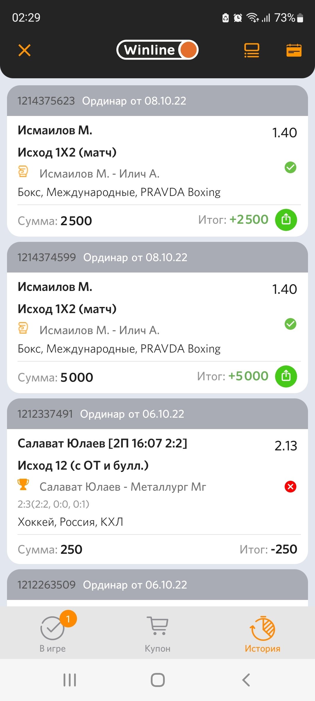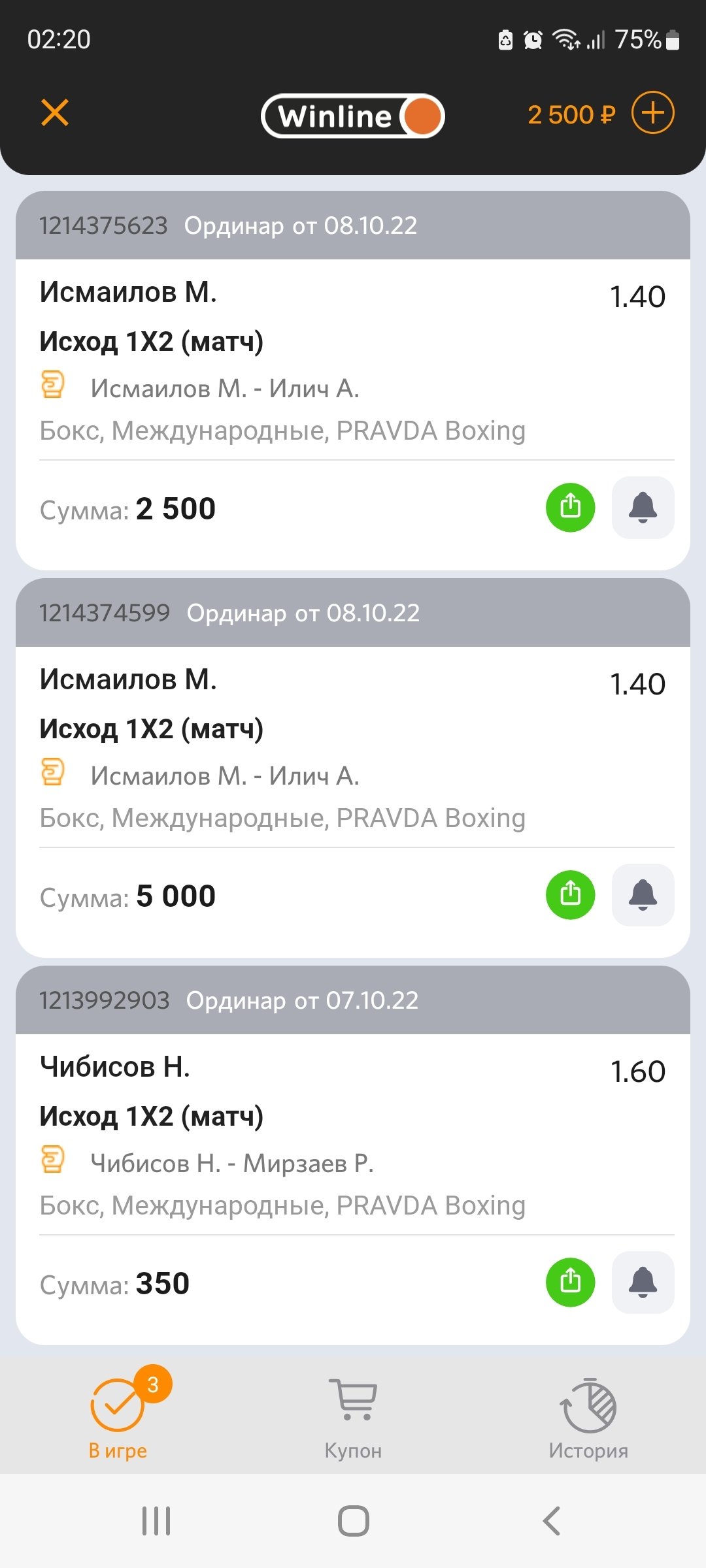 Поставил 2 ставки на бой Илич- Исмаилов Ординар. с Кэоффицентом Оба прошли. Ставку делал до боя. Но почему то при конечном рассчете ставку просто вернули без коэффицента.