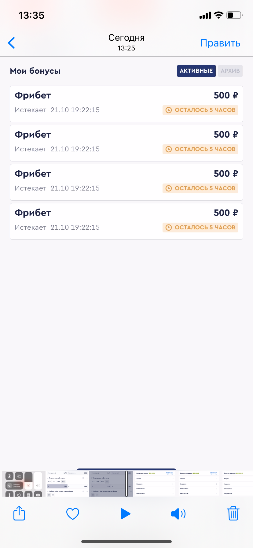 Так же смотрите, я снял запись экрана, где показал, что я не могу ставить эти фрибеты, даже те 2000, которые они типа начисляли, как сказали вам, но по факту даже их не начислили, видео не грузится, поэтому сделал скриншоты из записи экрана, так же по прежнему надеюсь, что у вас удастся помочь мне, заранее спасибо 🙏