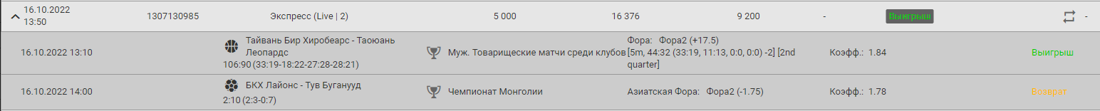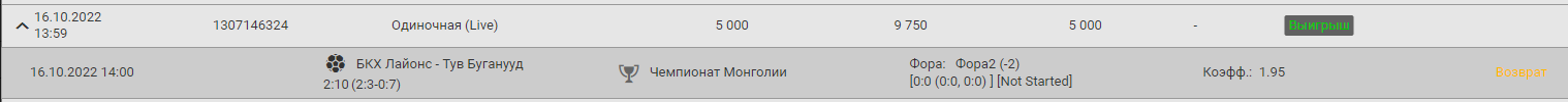 Сделал ставку на футбол Монголии БКХ Лайонс - Тув Буганууд, когда счет был 2-9 дали возврат по купону 1307146324 фора 2 (-2) сделанному в лайве, у меня был и пресс по линии 1307130985, так же на миносовую фору 2, его они расчитали . Я заказал выплату всех средств 45000, и написал им об этом. Они ответили, что это договорняк, я уточнил, а по линии не договорняк? После этого они отклонили выплату и вернули ставку и по линии