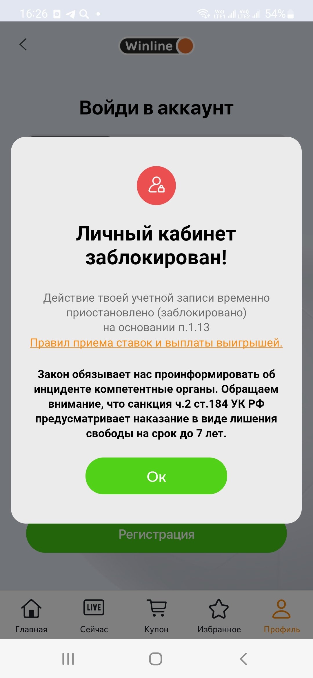 По информации от букмекера, на текущий момент проводится проверка по соблюдению правил Честной игры. Аккаунт заблокирован на срок до 1 года, согласно п.п. 1.13. Подробной информации, аргументирующей причины блокировки аккаунта, букмекером не предоставлено.