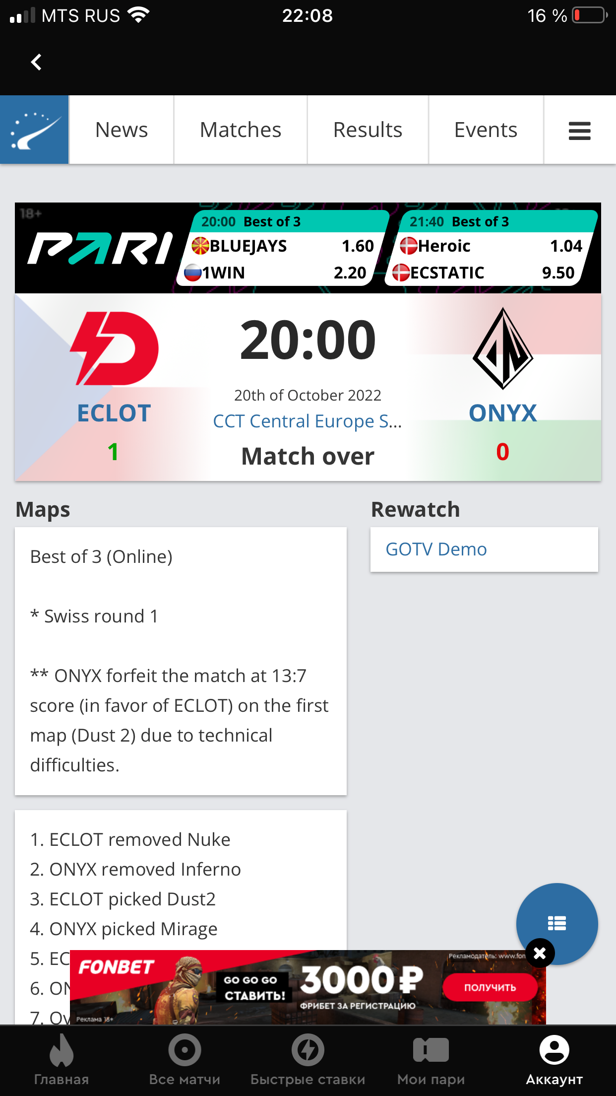 Делала ставки в БК Фонбет на игры . В одном из матчей произошёл технический сбои, по итогам которого матч закончился на 1 карте, получается что матч не был доигран из за технического сбоя, и нужно данный матч рассчитать с кф. 1, но букмекер решил по своему и рассчитал ставку проигрышной, прошу помочь в решении данного спора. Вот источник данного матча, в котором говорится, что команда ONYX проиграли матч со счетом 13:7 (в пользу ECLOT) на первой карте (Dust 2) по техническим причинам Получается, что в данном случае матч завершён по техническим причинам, но букмекер говорит что в случае отказа или дисквалификации засчитывается поражение. Тут в корне не согласна. Ставила 2 ставки на разные кф. 8789664369 и 8789917233, скрин прилагаю
